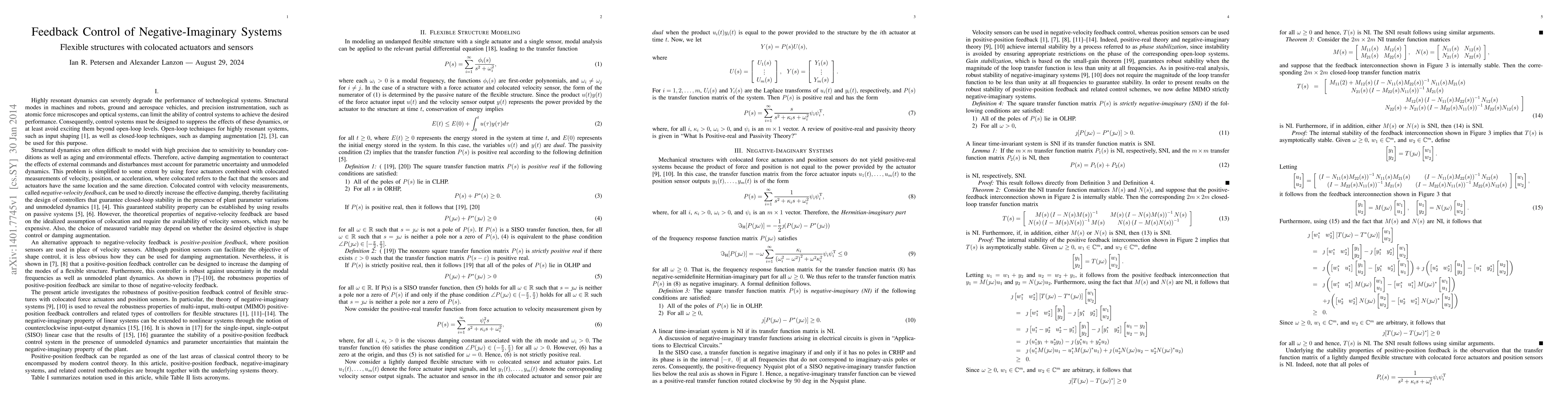 This paper presents a survey of recent results on the theory of negative imaginary systems. This theory can be applied to the robust control of large flexible structures with colocated force actuators and position sensors.