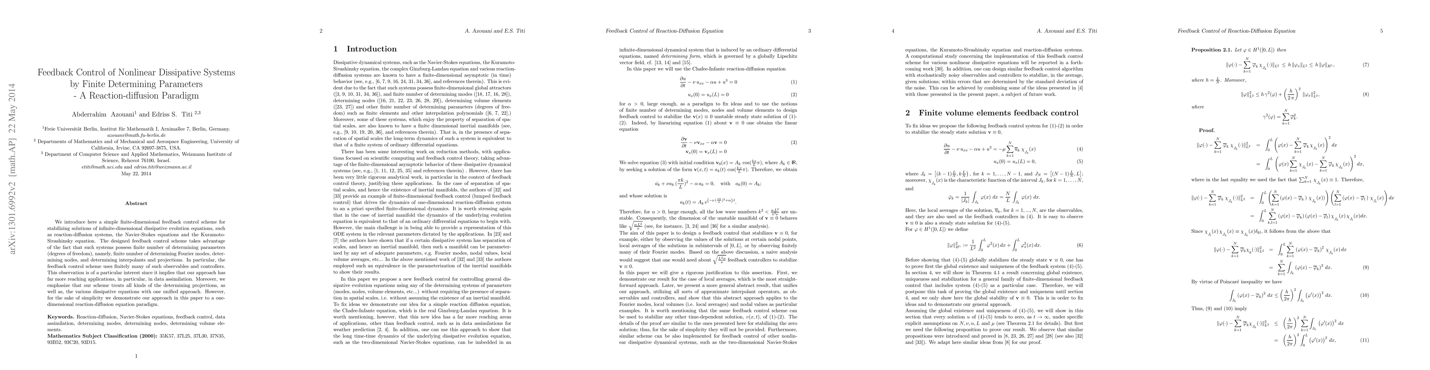 This paper proposes a finite-dimensional feedback control scheme to stabilize solutions of infinite-dimensional dissipative evolution equations, such as reaction-diffusion systems, using a limited number of determining parameters. The approach is demonstrated through a one-dimensional reaction-diffusion equation, highlighting its potential applications in data assimilation.