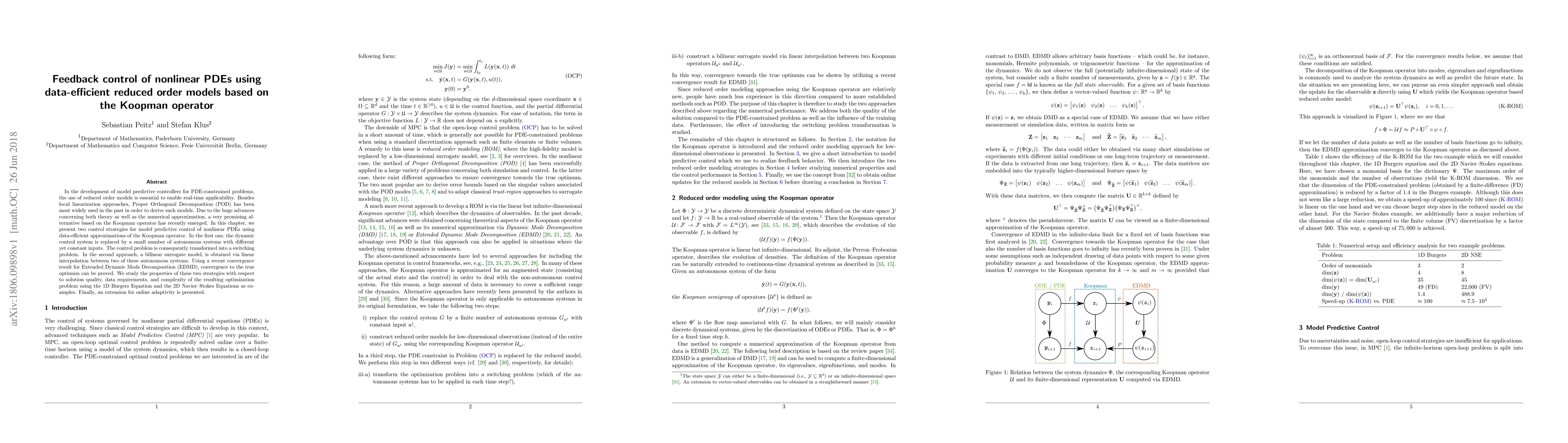 In the development of model predictive controllers for PDE-constrained problems, the use of reduced order models is essential to enable real-time applicability. Besides local linearization approaches, Proper Orthogonal Decomposition (POD) has been most widely used in the past in order to derive such models. Due to the huge advances concerning both theory as well as the numerical approximation, a very promising alternative based on the Koopman operator has recently emerged. In this chapter, we present two control strategies for model predictive control of nonlinear PDEs using data-efficient approximations of the Koopman operator. In the first one, the dynamic control system is replaced by a small number of autonomous systems with different yet constant inputs. The control problem is consequently transformed into a switching problem. In the second approach, a bilinear surrogate model, is obtained via linear interpolation between two of these autonomous systems. Using a recent convergence result for Extended Dynamic Mode Decomposition (EDMD), convergence to the true optimum can be proved. We study the properties of these two strategies with respect to solution quality, data requirements, and complexity of the resulting optimization problem using the 1D Burgers Equation and the 2D Navier-Stokes Equations as examples. Finally, an extension for online adaptivity is presented.