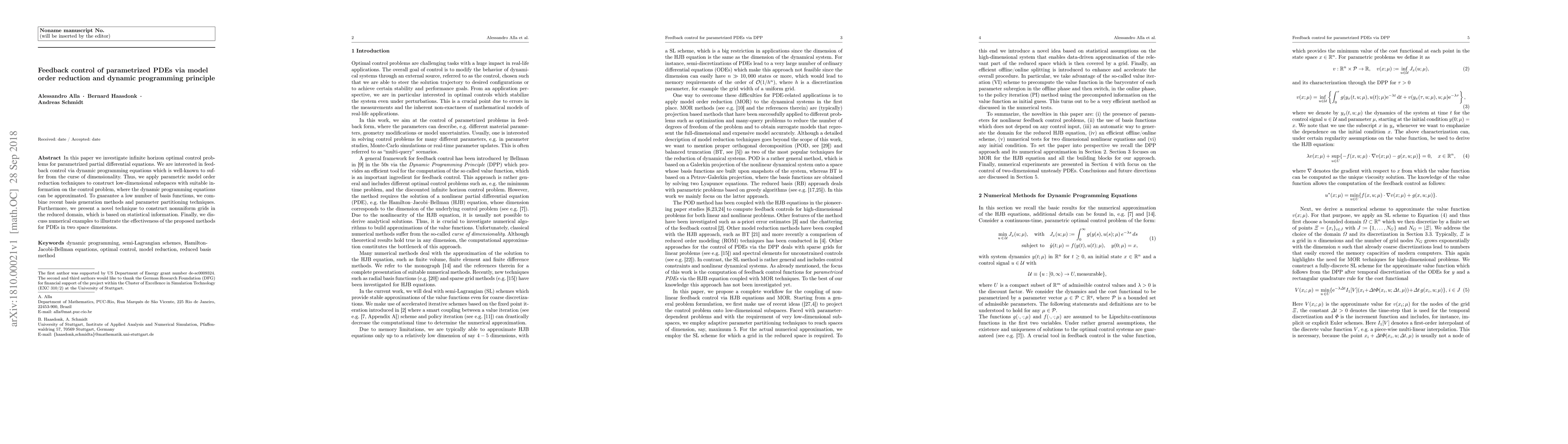 This paper explores optimal control of parametrized partial differential equations (PDEs) using model order reduction and dynamic programming. It introduces novel techniques to reduce dimensionality and construct nonuniform grids, aiming to mitigate the curse of dimensionality in feedback control.