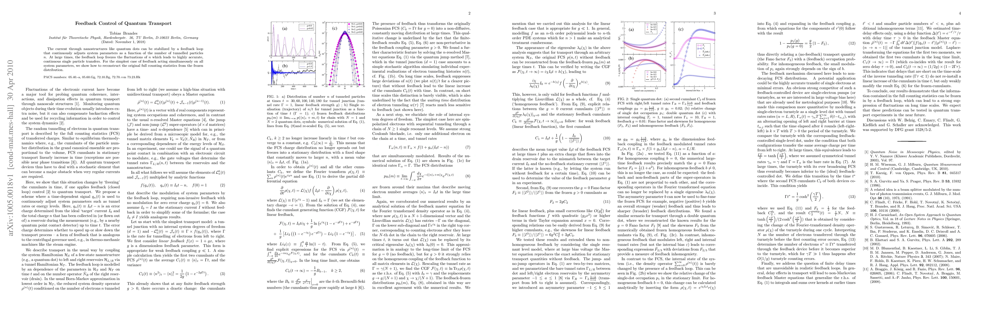 A feedback loop helps stabilize current in nanostructures like quantum dots by adjusting system parameters based on tunnelled particles. This leads to accurate single-particle transfers with frozen fluctuations.