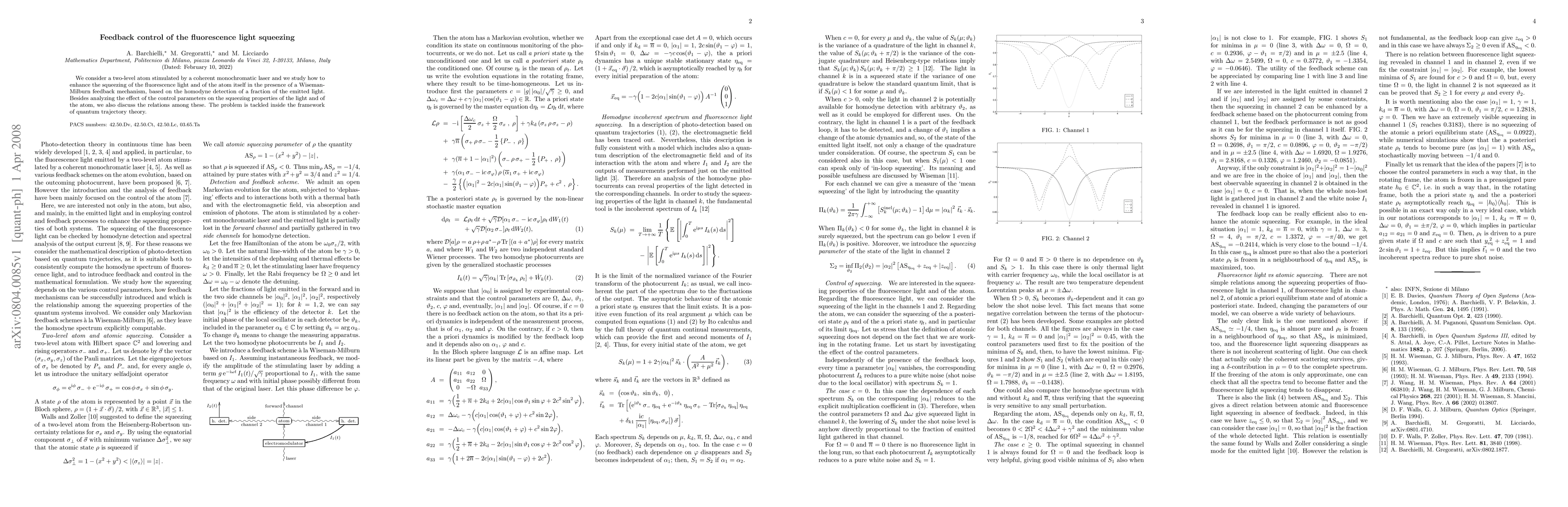 This paper explores enhancing fluorescence light squeezing and atom dynamics using Wiseman-Milburn feedback controlled by homodyne detection, analyzing the impact of control parameters within quantum trajectory theory. The study reveals relationships between the light and atom's squeezing properties.