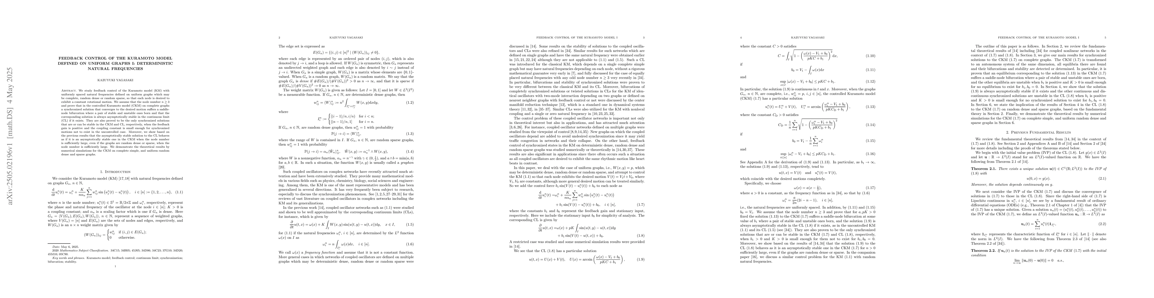 The paper presents a detailed theoretical analysis of feedback control in the Kuramoto model on uniform graphs, including proofs of existence and stability of synchronized solutions, as well as bifurcation analysis.