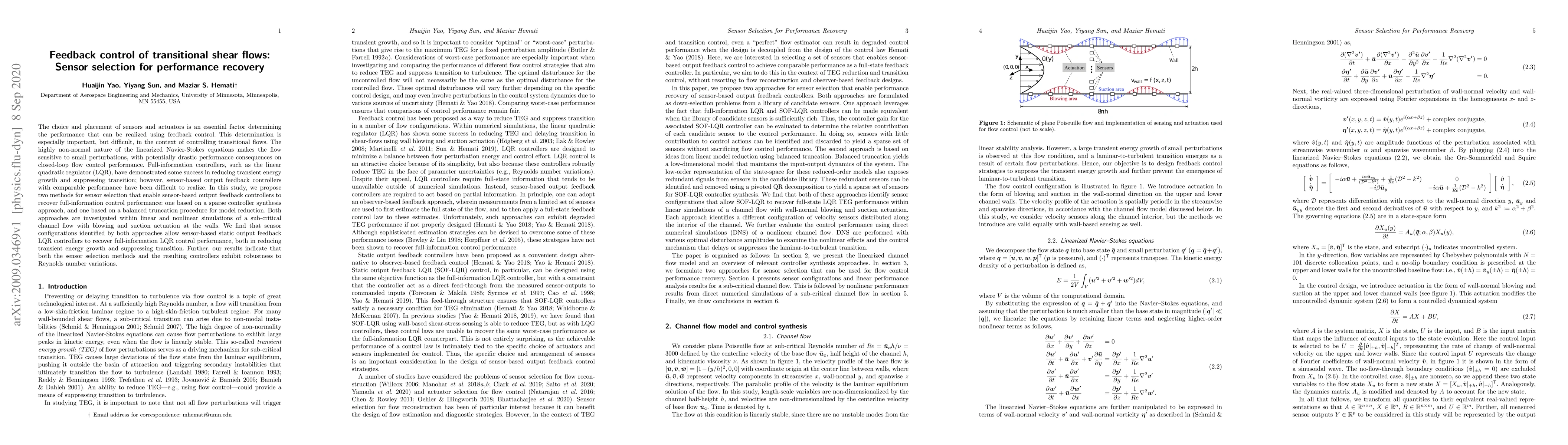 This paper proposes two methods for selecting sensors to enable sensor-based output feedback controllers to achieve performance comparable to full-information controllers in transitional shear flows. The methods involve sparse controller synthesis and balanced truncation, both showing robustness and effectiveness in simulations of sub-critical channel flow.