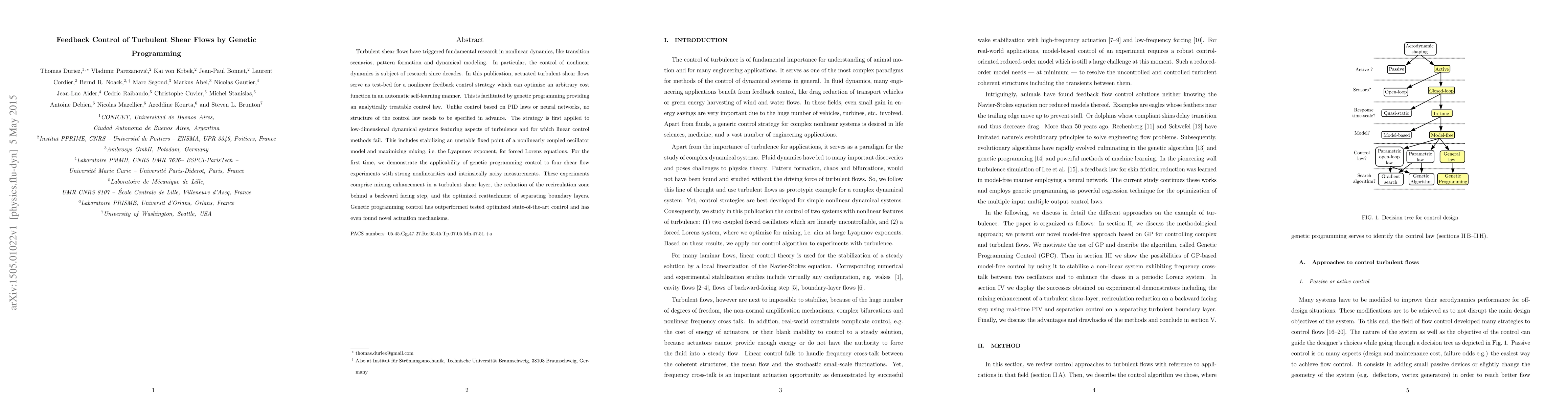 This paper explores the use of genetic programming for optimizing feedback control in turbulent shear flows, demonstrating its effectiveness in stabilizing unstable points and enhancing mixing, outperforming traditional control methods in several experimental setups.