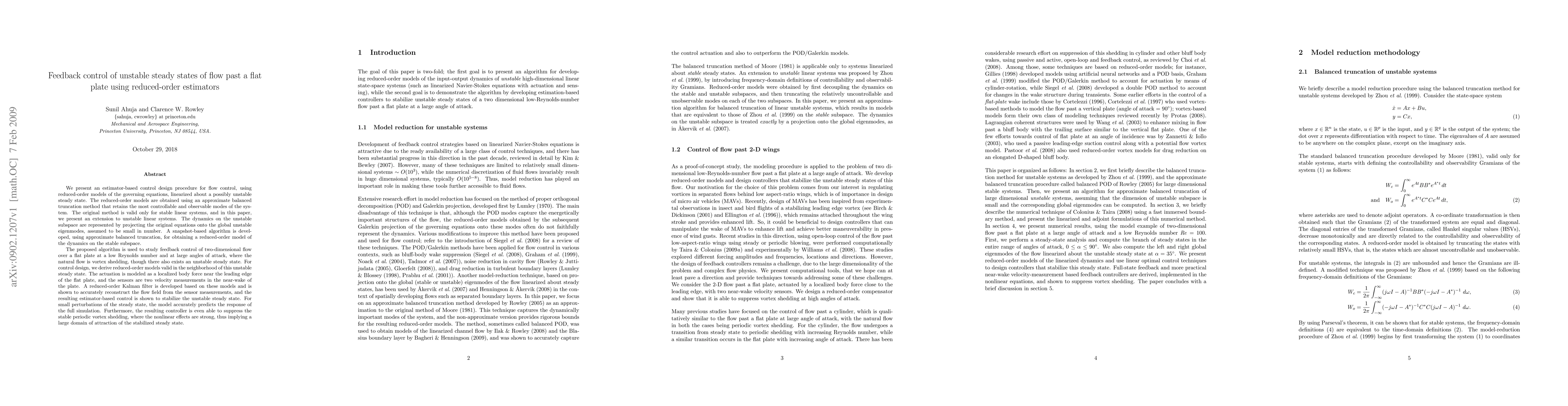 We present an estimator-based control design procedure for flow control, using reduced-order models of the governing equations, linearized about a possibly unstable steady state. The reduced models are obtained using an approximate balanced truncation method that retains the most controllable and observable modes of the system. The original method is valid only for stable linear systems, and we present an extension to unstable linear systems. The dynamics on the unstable subspace are represented by projecting the original equations onto the global unstable eigenmodes, assumed to be small in number. A snapshot-based algorithm is developed, using approximate balanced truncation, for obtaining a reduced-order model of the dynamics on the stable subspace. The proposed algorithm is used to study feedback control of 2-D flow over a flat plate at a low Reynolds number and at large angles of attack, where the natural flow is vortex shedding, though there also exists an unstable steady state. For control design, we derive reduced-order models valid in the neighborhood of this unstable steady state. The actuation is modeled as a localized body force near the leading edge of the flat plate, and the sensors are two velocity measurements in the near-wake of the plate. A reduced-order Kalman filter is developed based on these models and is shown to accurately reconstruct the flow field from the sensor measurements, and the resulting estimator-based control is shown to stabilize the unstable steady state. For small perturbations of the steady state, the model accurately predicts the response of the full simulation. Furthermore, the resulting controller is even able to suppress the stable periodic vortex shedding, where the nonlinear effects are strong, thus implying a large domain of attraction of the stabilized steady state.