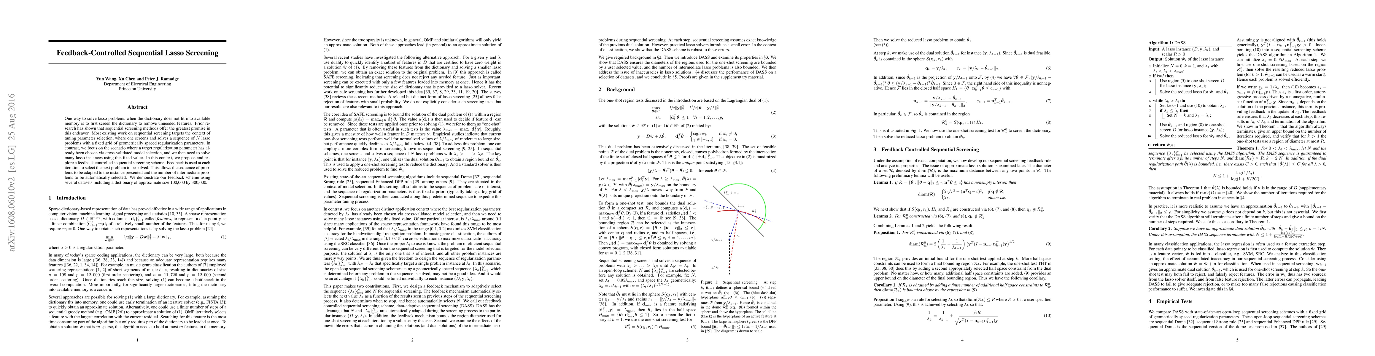 One way to solve lasso problems when the dictionary does not fit into available memory is to first screen the dictionary to remove unneeded features. Prior research has shown that sequential screening methods offer the greatest promise in this endeavor. Most existing work on sequential screening targets the context of tuning parameter selection, where one screens and solves a sequence of $N$ lasso problems with a fixed grid of geometrically spaced regularization parameters. In contrast, we focus on the scenario where a target regularization parameter has already been chosen via cross-validated model selection, and we then need to solve many lasso instances using this fixed value. In this context, we propose and explore a feedback controlled sequential screening scheme. Feedback is used at each iteration to select the next problem to be solved. This allows the sequence of problems to be adapted to the instance presented and the number of intermediate problems to be automatically selected. We demonstrate our feedback scheme using several datasets including a dictionary of approximate size 100,000 by 300,000.