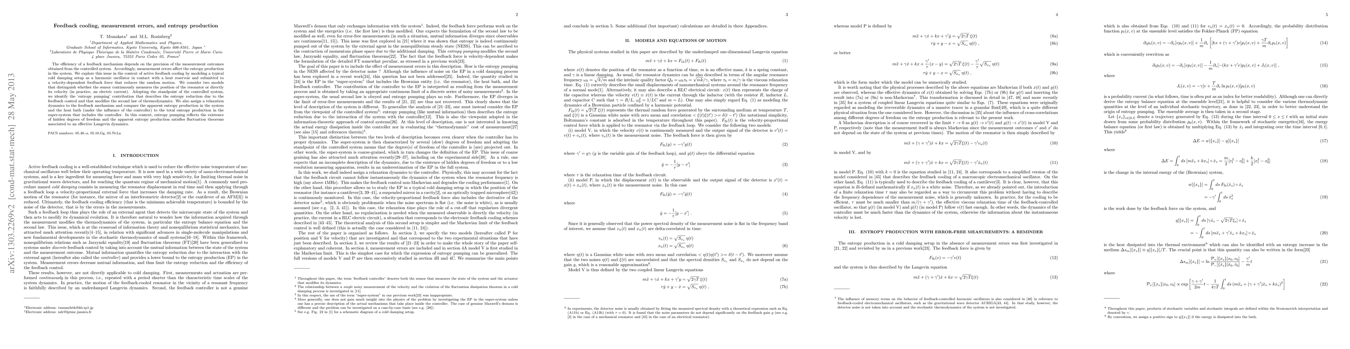 The efficiency of a feedback mechanism depends on the precision of the measurement outcomes obtained from the controlled system. Accordingly, measurement errors affect the entropy production in the system. We explore this issue in the context of active feedback cooling by modeling a typical cold damping setup as a harmonic oscillator in contact with a heat reservoir and submitted to a velocity-dependent feedback force that reduces the random motion. We consider two models that distinguish whether the sensor continuously measures the position of the resonator or directly its velocity (in practice, an electric current). Adopting the standpoint of the controlled system, we identify the `entropy pumping' contribution that describes the entropy reduction due to the feedback control and that modifies the second law of thermodynamics. We also assign a relaxation dynamics to the feedback mechanism and compare the apparent entropy production in the system and the heat bath to the total entropy production in the super-system that includes the controller. In this context, entropy pumping reflects the existence of hidden degrees of freedom and the apparent entropy production satisfies fluctuation theorems associated to an effective Langevin dynamics.