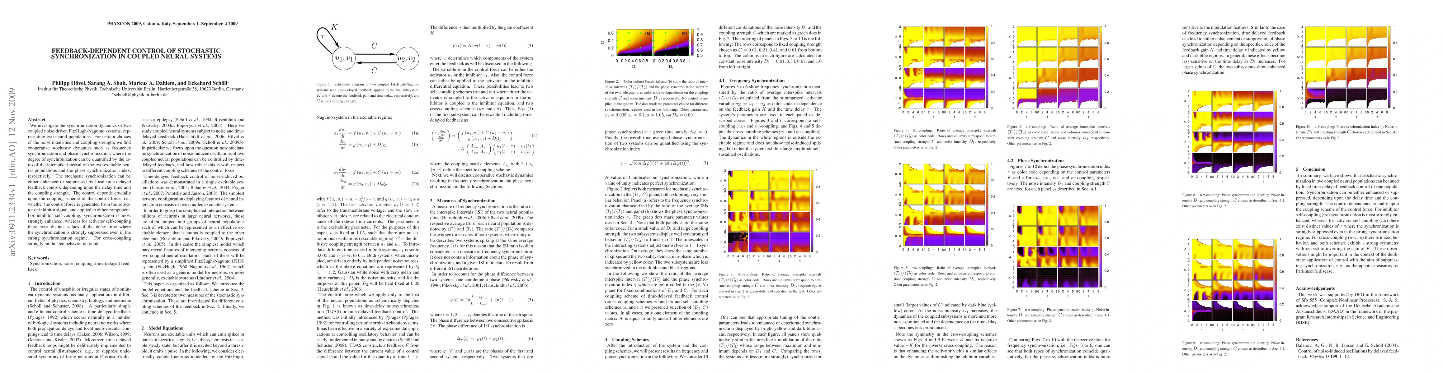 This paper explores synchronization dynamics in two coupled FitzHugh-Nagumo systems representing neural populations under stochastic influences. It finds that synchronization can be controlled via local time-delayed feedback, with the degree of control depending on the coupling scheme and delay time.