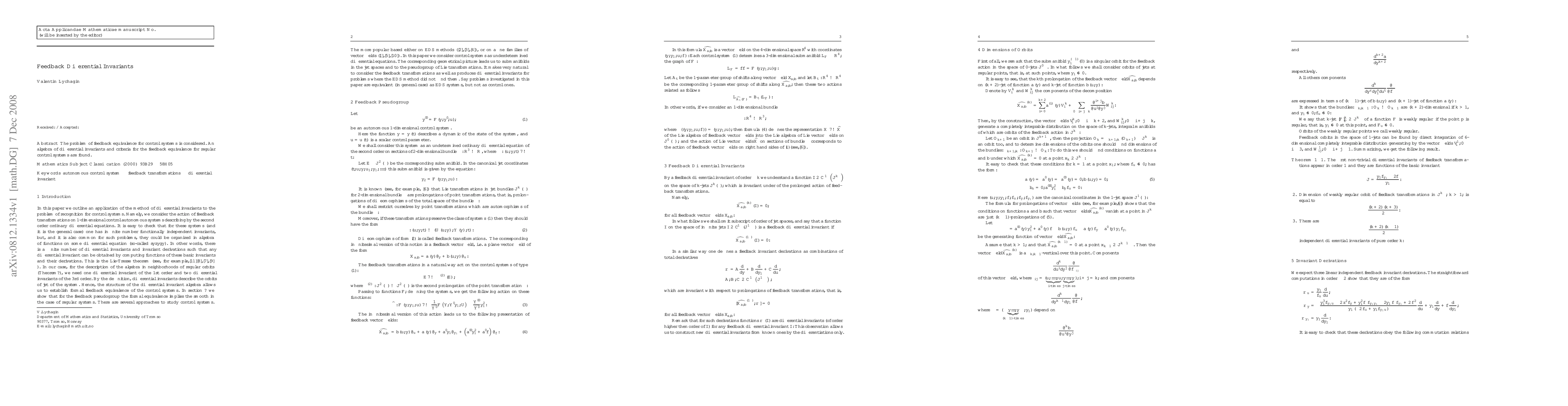 Summary: This paper investigates feedback equivalence in control systems, establishing an algebra of differential invariants and providing criteria to determine such equivalence for regular control systems.