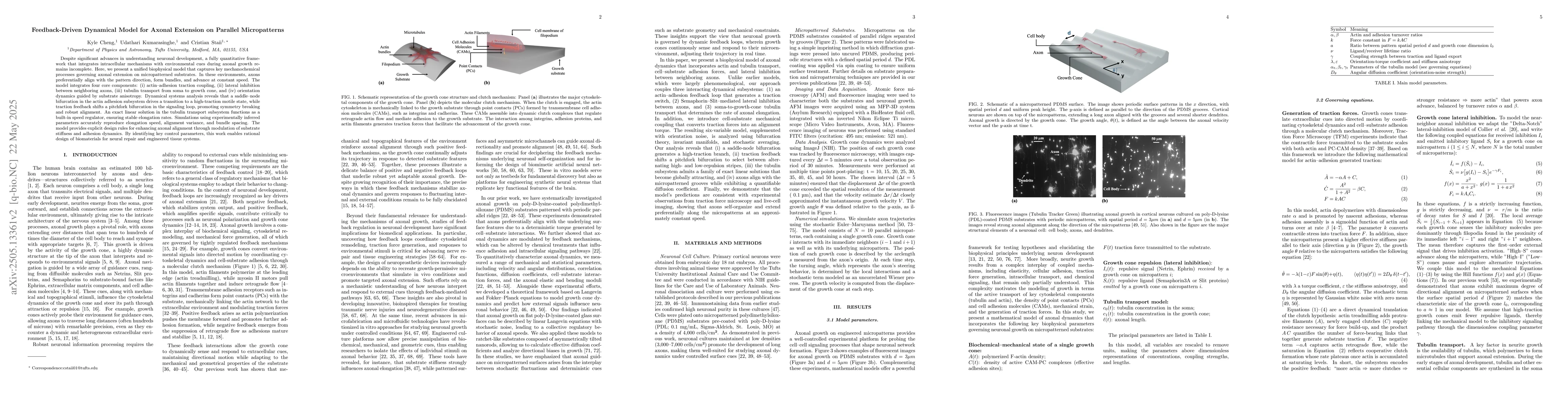 Despite significant advances in understanding neuronal development, a fully quantitative framework that integrates intracellular mechanisms with environmental cues during axonal growth remains incomplete. Here, we present a unified biophysical model that captures key mechanochemical processes governing axonal extension on micropatterned substrates. In these environments, axons preferentially align with the pattern direction, form bundles, and advance at constant speed. The model integrates four core components: (i) actin-adhesion traction coupling, (ii) lateral inhibition between neighboring axons, (iii) tubulin transport from soma to the growth cone, and (4) orientation dynamics guided by the substrate anisotropy. Dynamical systems analysis reveals that the saddle-node bifurcation in the actin adhesion subsystem drives a transition to a high-traction motile state, while traction feedback shifts a pitchfork bifurcation in the signaling loop, promoting symmetry breaking and robust alignment. An exact linear solution in the tubulin transport subsystem functions as a built-in speed regulator, ensuring stable elongation rates. Simulations using experimentally inferred parameters accurately reproduce elongation speed, alignment variance, and bundle spacing. The model provides explicit design rules for enhancing axonal alignment through modulation of substrate stiffness and adhesion dynamics. By identifying key control parameters, this work enables rational design of biomaterials for neural repair and engineered tissue systems.