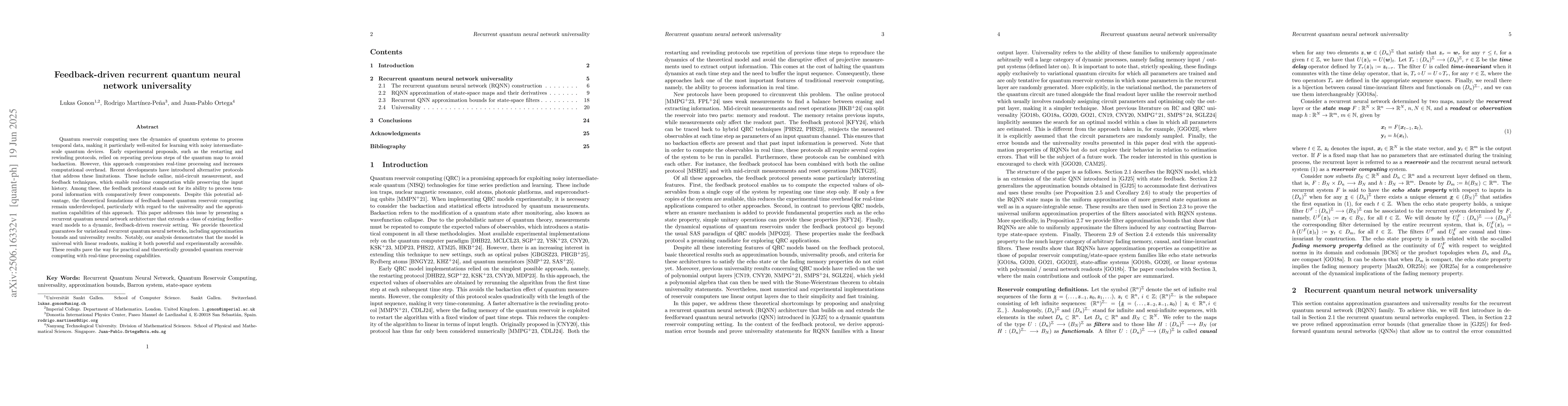 Quantum reservoir computing uses the dynamics of quantum systems to process temporal data, making it particularly well-suited for learning with noisy intermediate-scale quantum devices. Early experimental proposals, such as the restarting and rewinding protocols, relied on repeating previous steps of the quantum map to avoid backaction. However, this approach compromises real-time processing and increases computational overhead. Recent developments have introduced alternative protocols that address these limitations. These include online, mid-circuit measurement, and feedback techniques, which enable real-time computation while preserving the input history. Among these, the feedback protocol stands out for its ability to process temporal information with comparatively fewer components. Despite this potential advantage, the theoretical foundations of feedback-based quantum reservoir computing remain underdeveloped, particularly with regard to the universality and the approximation capabilities of this approach. This paper addresses this issue by presenting a recurrent quantum neural network architecture that extends a class of existing feedforward models to a dynamic, feedback-driven reservoir setting. We provide theoretical guarantees for variational recurrent quantum neural networks, including approximation bounds and universality results. Notably, our analysis demonstrates that the model is universal with linear readouts, making it both powerful and experimentally accessible. These results pave the way for practical and theoretically grounded quantum reservoir computing with real-time processing capabilities.