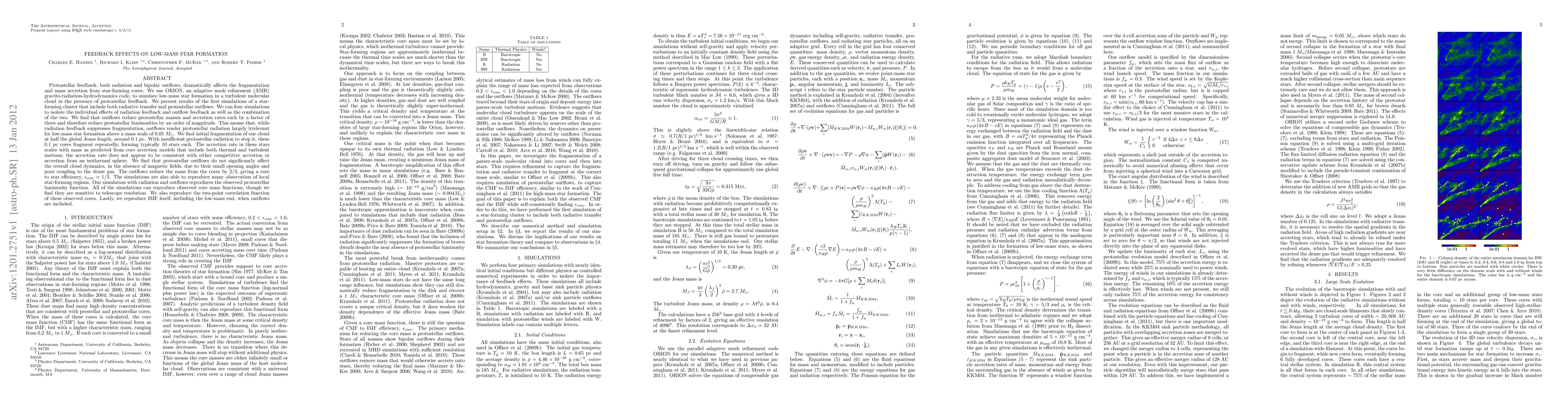 Protostellar feedback, both radiation and bipolar outflows, dramatically affects the fragmentation and mass accretion from star-forming cores. We use ORION, an adaptive mesh refinement gravito-radiation-hydrodynamics code, to simulate the formation of a cluster of low-mass stars, including both radiative transfer and protostellar outflows. We ran four simulations to isolate the individual effects of radiation feedback and outflow feedback as well as the combination of the two. Outflows reduce protostellar masses and accretion rates each by a factor of three and therefore reduce protostellar luminosities by an order of magnitude. Thus, while radiation feedback suppresses fragmentation, outflows render protostellar radiation largely irrelevant for low-mass star formation above a mass scale of 0.05 M_sun. We find initial fragmentation of our cloud at half the global Jeans length, ~ 0.1 pc. With insufficient protostellar radiation to stop it, these 0.1 pc cores fragment repeatedly, forming typically 10 stars each. The accretion rate in these stars scales with mass as predicted from core accretion models that include both thermal and turbulent motions. We find that protostellar outflows do not significantly affect the overall cloud dynamics, in the absence of magnetic fields, due to their small opening angles and poor coupling to the dense gas. The outflows reduce the mass from the cores by 2/3, giving a core to star efficiency ~ 1/3. The simulation with radiation and outflows reproduces the observed protostellar luminosity function. All of the simulations can reproduce observed core mass functions, though they are sensitive to telescope resolution. The simulation with both radiation and outflows reproduces the galactic IMF and the two-point correlation function of the cores observed in rho Oph.