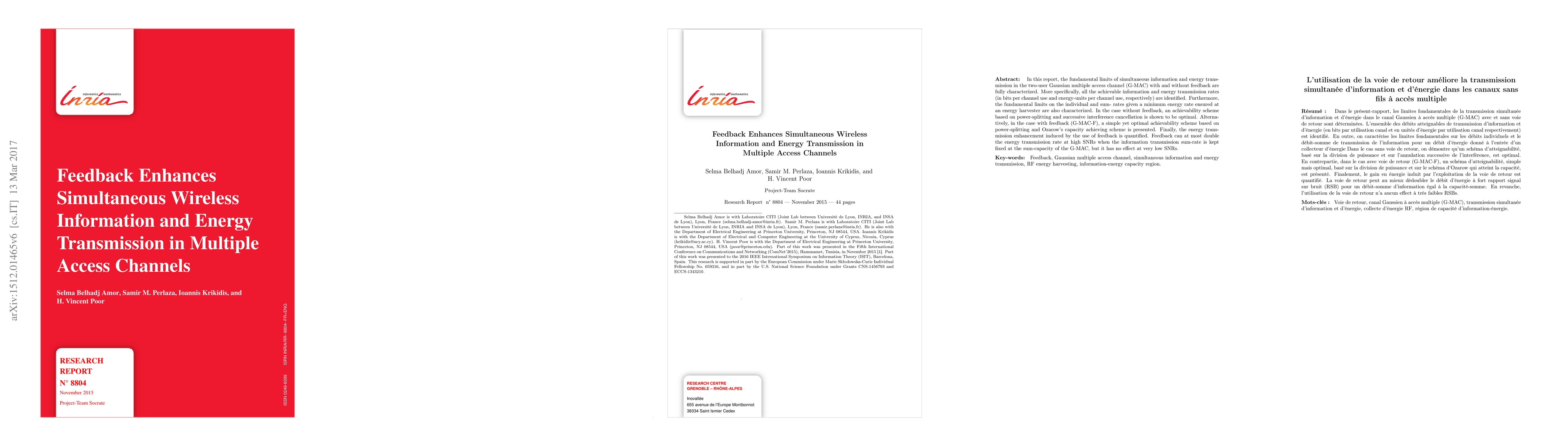 In this report, the fundamental limits of simultaneous information and energy transmission in the two-user Gaussian multiple access channel (G-MAC) with and without feedback are fully characterized. More specifically, all the achievable information and energy transmission rates (in bits per channel use and energy-units per channel use, respectively) are identified. Furthermore, the fundamental limits on the individual and sum- rates given a minimum energy rate ensured at an energy harvester are also characterized. In the case without feedback, an achievability scheme based on power-splitting and successive interference cancellation is shown to be optimal. Alternatively, in the case with feedback (G-MAC-F), a simple yet optimal achievability scheme based on power-splitting and Ozarow's capacity achieving scheme is presented. Finally, the energy transmission enhancement induced by the use of feedback is quantified. Feedback can at most double the energy transmission rate at high SNRs when the information transmission sum-rate is kept fixed at the sum-capacity of the G-MAC, but it has no effect at very low SNRs.