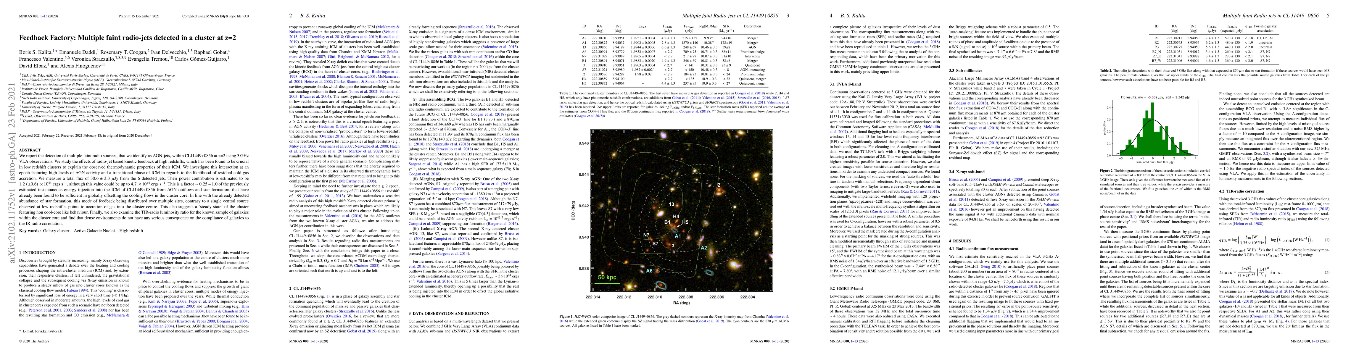 The paper reports the detection of multiple faint radio jets in the cluster CLJ1449+0856 at z=2, suggesting distributed AGN-jet based kinetic feedback crucial for explaining the thermodynamic properties of the ICM. The detected jets contribute significantly to the cluster's energy budget, indicating a potential steady state and non cool-core behavior.