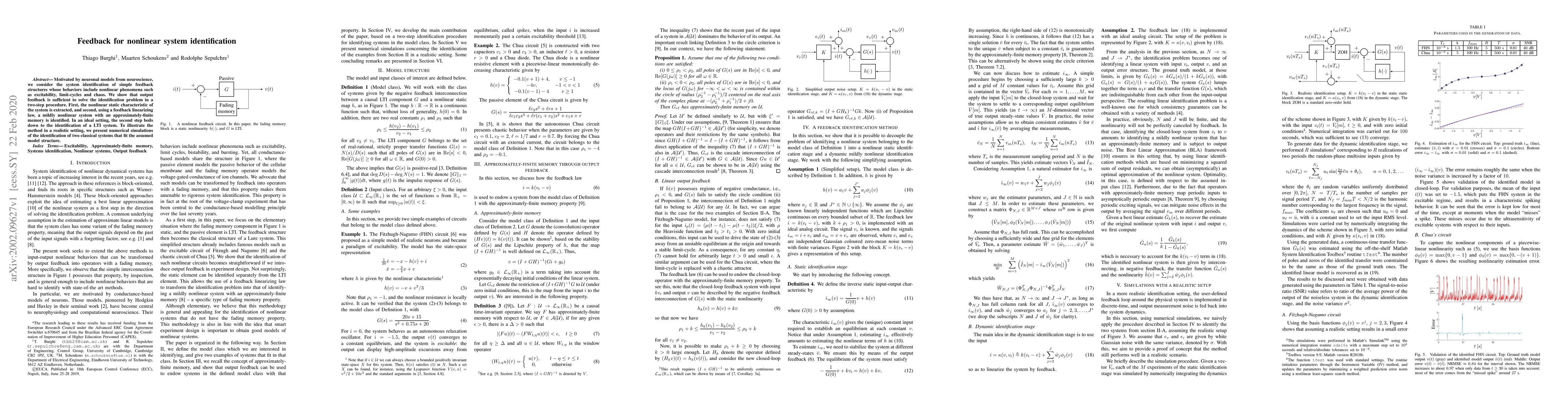Motivated by neuronal models from neuroscience, we consider the system identification of simple feedback structures whose behaviors include nonlinear phenomena such as excitability, limit-cycles and chaos. We show that output feedback is sufficient to solve the identification problem in a two-step procedure. First, the nonlinear static characteristic of the system is extracted, and second, using a feedback linearizing law, a mildly nonlinear system with an approximately-finite memory is identified. In an ideal setting, the second step boils down to the identification of a LTI system. To illustrate the method in a realistic setting, we present numerical simulations of the identification of two classical systems that fit the assumed model structure.
