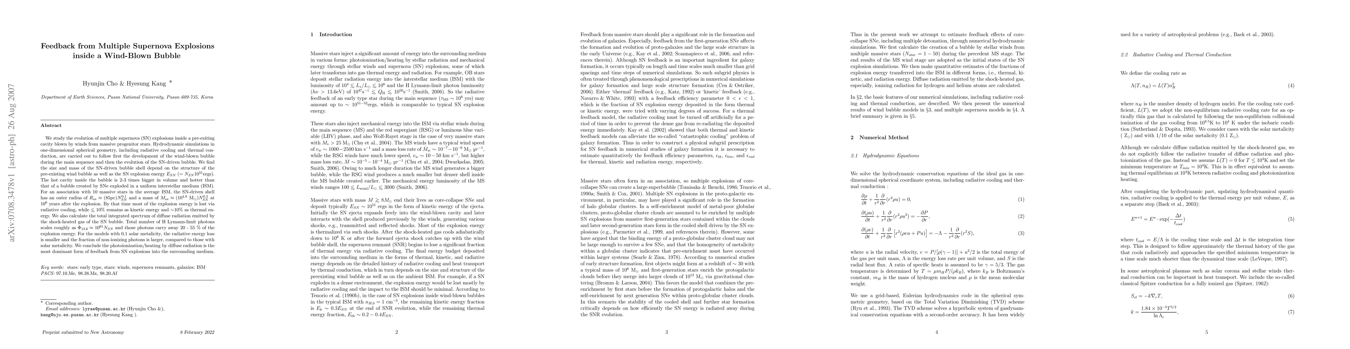 We study the evolution of multiple supernova (SN) explosions inside a pre-exiting cavity blown by winds from massive progenitor stars. Hydrodynamic simulations in one-dimensional spherical geometry, including radiative cooling and thermal conduction, are carried out to follow first the development of the wind-blown bubble during the main sequence and then the evolution of the SN-driven bubble. We find the size and mass of the SN-driven bubble shell depend on the structure of the pre-existing wind bubble as well as the SN explosion energy E_{SN} (= N_{SN} 10^{51} ergs). The hot cavity inside the bubble is 2-3 times bigger in volume and hotter than that of a bubble created by SNe exploded in a uniform interstellar medium (ISM). For an association with 10 massive stars in the average ISM, the SN-driven shell has an outer radius of R_{ss} ~ (85 pc) N_{SN}^{0.1} and a mass of M_{ss} ~ (10^{4.8} Msun) N_{SN}^{0.3}at 10^6 years after the explosion. By that time most of the explosion energy is lost via radiative cooling, while ~10% remains as kinetic energy and ~10% as thermal energy. We also calculate the total integrated spectrum of diffuse radiation emitted by the shock-heated gas of the SN bubble. For the models with 0.1 solar metalicity, the radiative energy loss is smaller and the fraction of non-ionizing photons is larger, compared to those with solar metalicity. We conclude the photoionization/heating by diffuse radiation is the most dominant form of feedback from SN explosions into the surrounding medium.