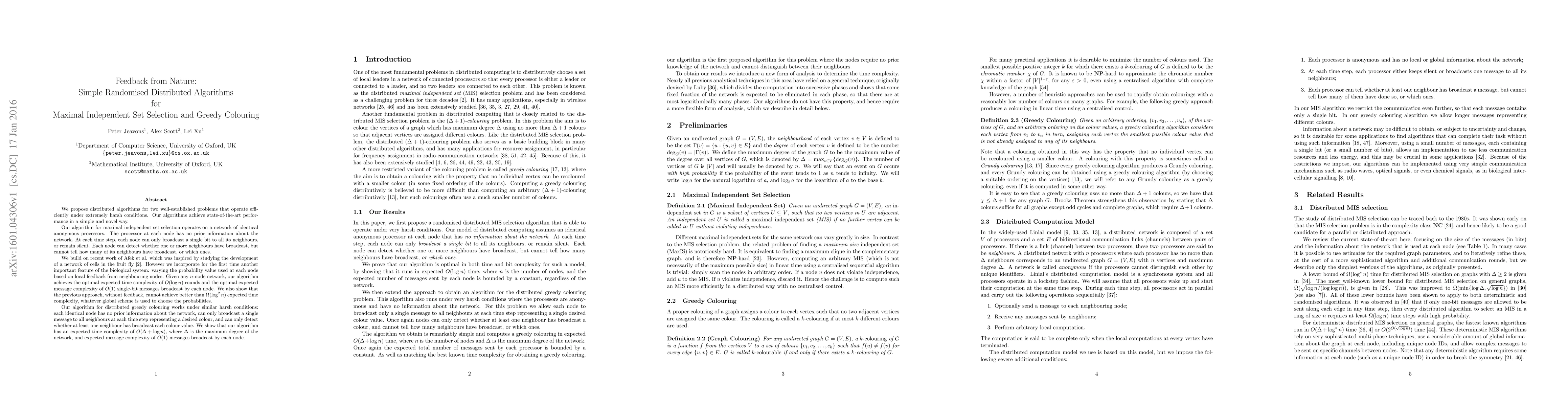We propose distributed algorithms for two well-established problems that operate efficiently under extremely harsh conditions. Our algorithms achieve state-of-the-art performance in a simple and novel way. Our algorithm for maximal independent set selection operates on a network of identical anonymous processors. The processor at each node has no prior information about the network. At each time step, each node can only broadcast a single bit to all its neighbours, or remain silent. Each node can detect whether one or more neighbours have broadcast, but cannot tell how many of its neighbours have broadcast, or which ones. We build on recent work of Afek et al. which was inspired by studying the development of a network of cells in the fruit fly~\cite{Afek2011a}. However we incorporate for the first time another important feature of the biological system: varying the probability value used at each node based on local feedback from neighbouring nodes. Given any $n$-node network, our algorithm achieves the optimal expected time complexity of $O(\log n)$ rounds and the optimal expected message complexity of $O(1)$ single-bit messages broadcast by each node.We also show that the previous approach, without feedback, cannot achieve better than $\Omega(\log^2 n)$ expected time complexity, whatever global scheme is used to choose the probabilities. Our algorithm for distributed greedy colouring works under similar harsh conditions: each identical node has no prior information about the network, can only broadcast a single message to all neighbours at each time step representing a desired colour, and can only detect whether at least one neighbour has broadcast each colour value. We show that our algorithm has an expected time complexity of $O(\Delta+\log n)$, where $\Delta$ is the maximum degree of the network, and expected message complexity of $O(1)$ messages broadcast by each node.