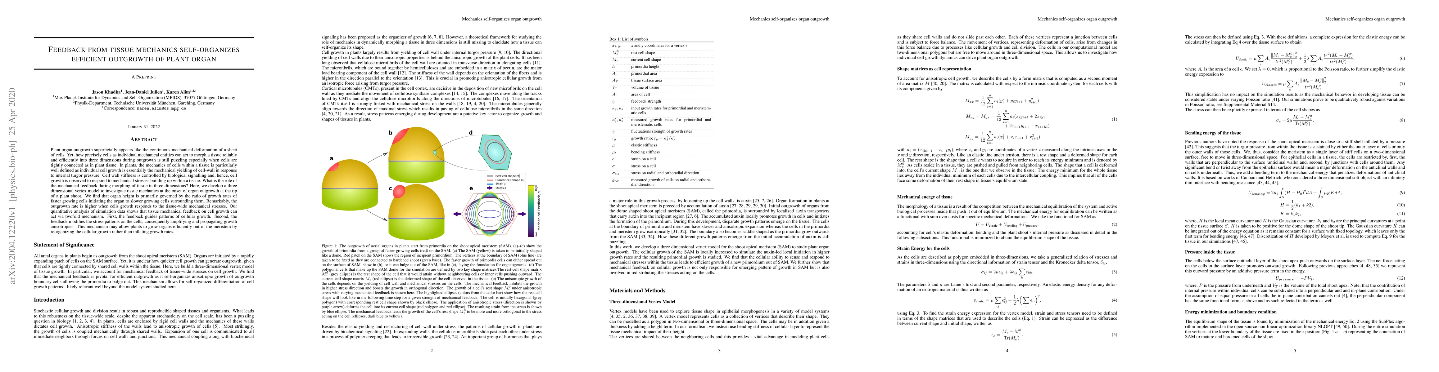 This paper investigates how mechanical feedback from tissue mechanics self-organizes efficient outgrowth of plant organs. It finds that tissue mechanical feedback guides cellular growth patterns and modifies stress patterns, allowing plants to efficiently grow organs by reorganizing cellular growth rather than increasing growth rates.