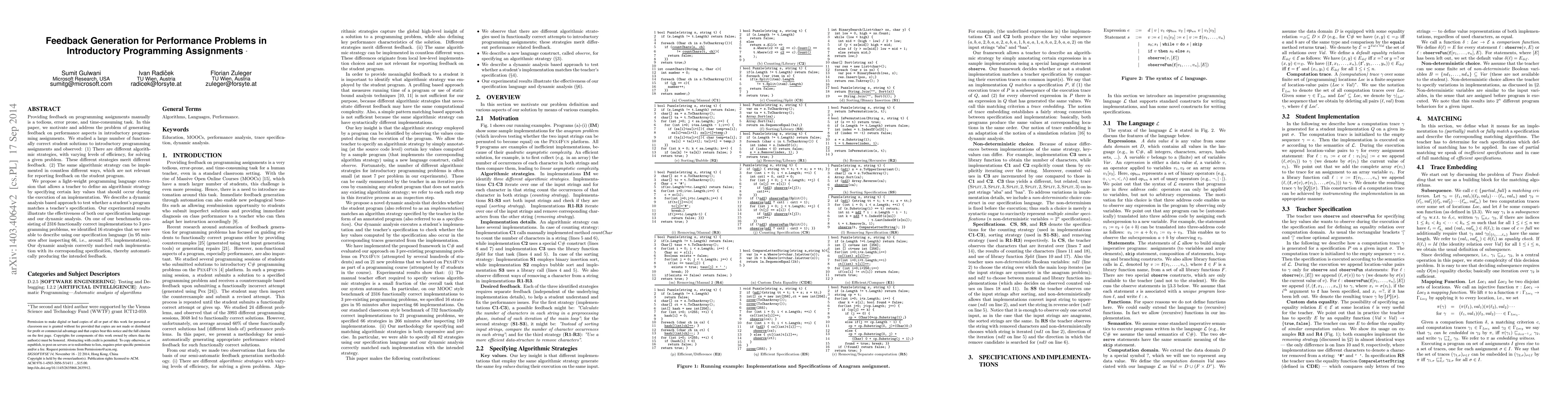 This paper addresses the challenge of generating automated feedback on performance aspects in introductory programming assignments. It proposes a lightweight language extension for teachers to define algorithmic strategies and uses dynamic analysis to match student implementations, successfully identifying and categorizing algorithmic strategies from a large set of functionally correct solutions.