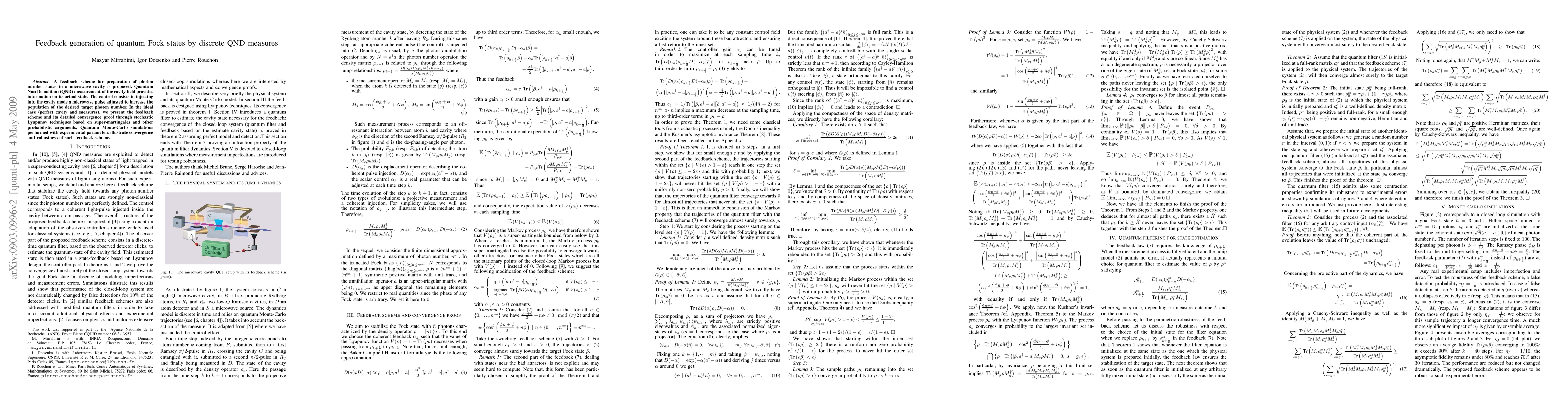 This paper proposes a feedback scheme for generating quantum Fock states using Quantum Non-Demolition (QND) measurements in a microwave cavity. The scheme adjusts microwave pulses to maximize the desired photon number, with theoretical convergence proven through stochastic Lyapunov techniques and validated by quantum Monte-Carlo simulations.