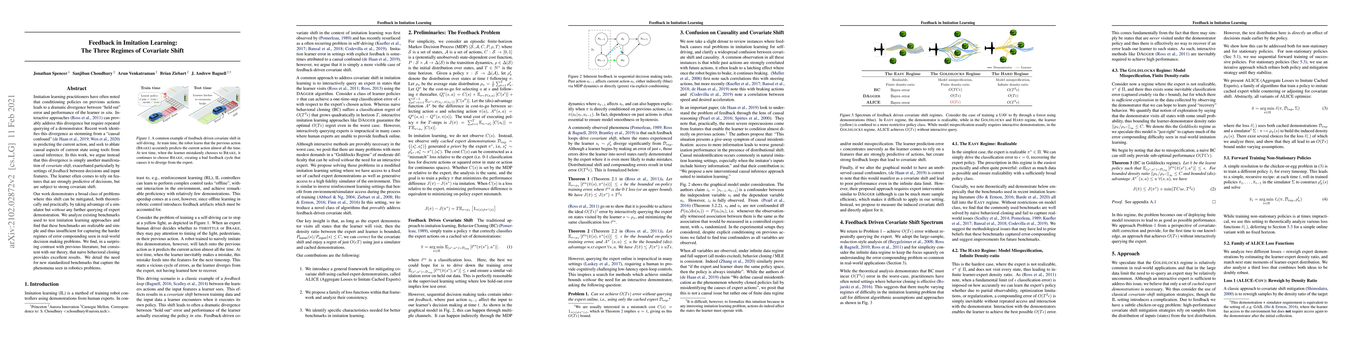 Imitation learning practitioners have often noted that conditioning policies on previous actions leads to a dramatic divergence between "held out" error and performance of the learner in situ. Interactive approaches can provably address this divergence but require repeated querying of a demonstrator. Recent work identifies this divergence as stemming from a "causal confound" in predicting the current action, and seek to ablate causal aspects of current state using tools from causal inference. In this work, we argue instead that this divergence is simply another manifestation of covariate shift, exacerbated particularly by settings of feedback between decisions and input features. The learner often comes to rely on features that are strongly predictive of decisions, but are subject to strong covariate shift. Our work demonstrates a broad class of problems where this shift can be mitigated, both theoretically and practically, by taking advantage of a simulator but without any further querying of expert demonstration. We analyze existing benchmarks used to test imitation learning approaches and find that these benchmarks are realizable and simple and thus insufficient for capturing the harder regimes of error compounding seen in real-world decision making problems. We find, in a surprising contrast with previous literature, but consistent with our theory, that naive behavioral cloning provides excellent results. We detail the need for new standardized benchmarks that capture the phenomena seen in robotics problems.