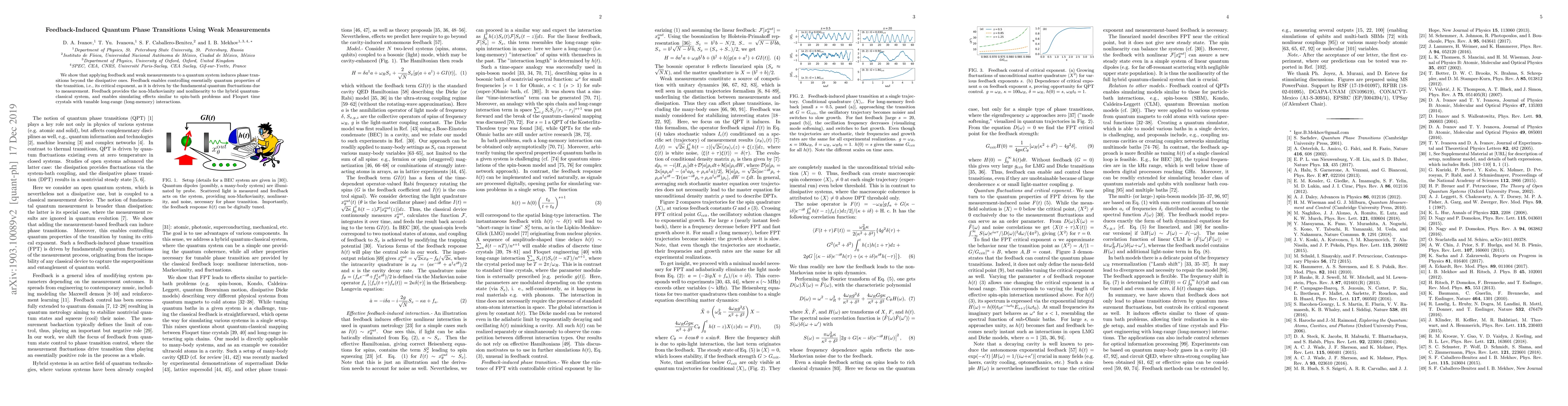 This paper demonstrates that feedback and weak measurements can induce quantum phase transitions in a quantum system, controlling the critical exponent through quantum fluctuations. The feedback introduces non-Markovianity and nonlinearity, enabling simulations of spin-bath problems and Floquet time crystals with tunable long-range interactions.