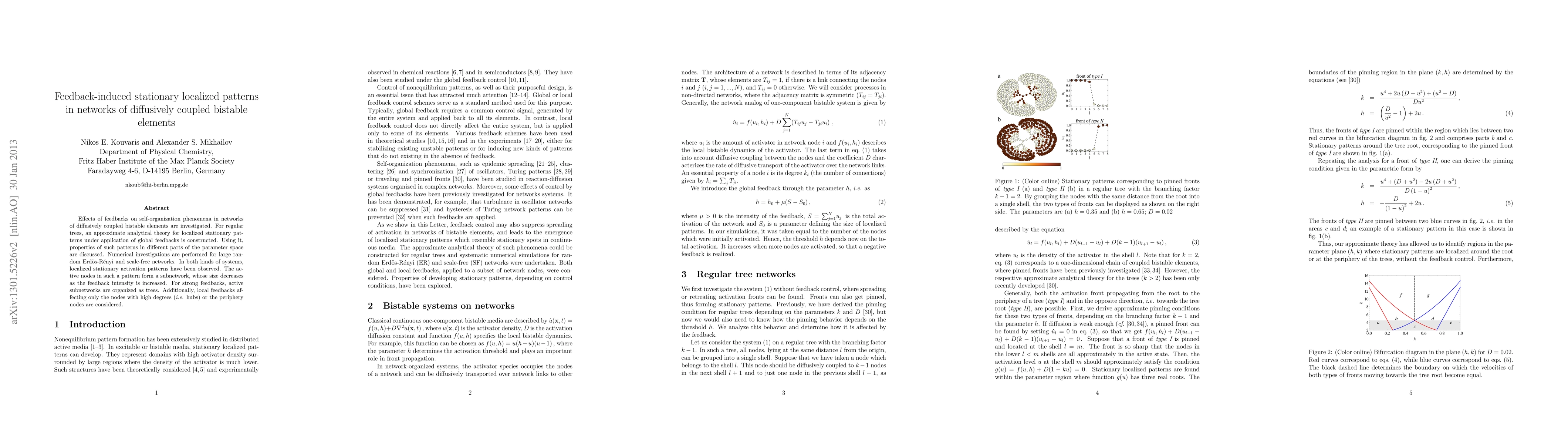 This work distinguishes itself by demonstrating feedback-induced stationary localized patterns in both random and scale-free networks, and by providing a theoretical framework for understanding their formation in regular trees.