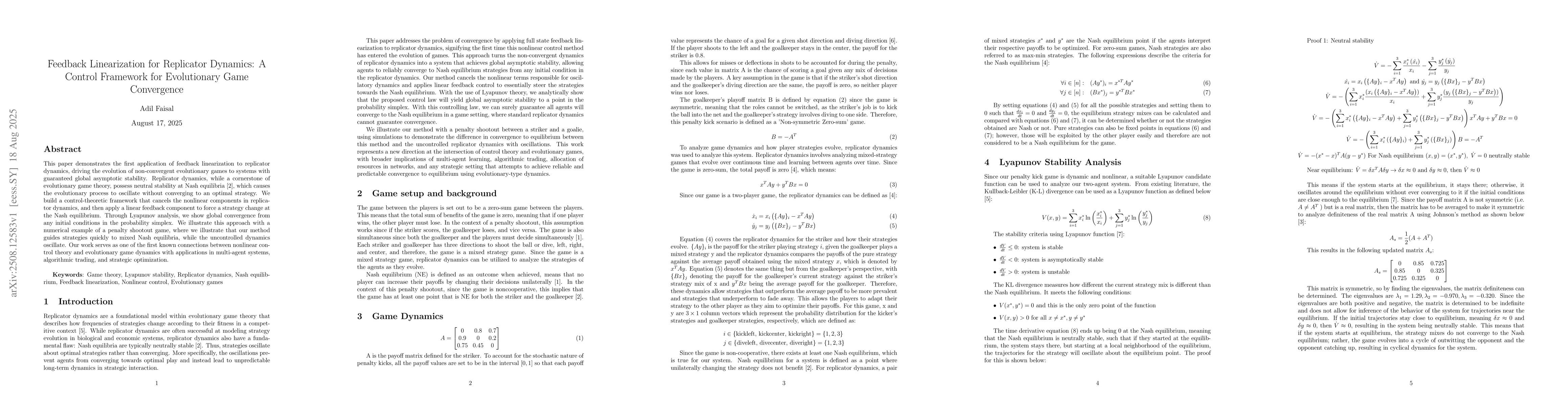 This paper demonstrates the first application of feedback linearization to replicator dynamics, driving the evolution of non-convergent evolutionary games to systems with guaranteed global asymptotic stability.