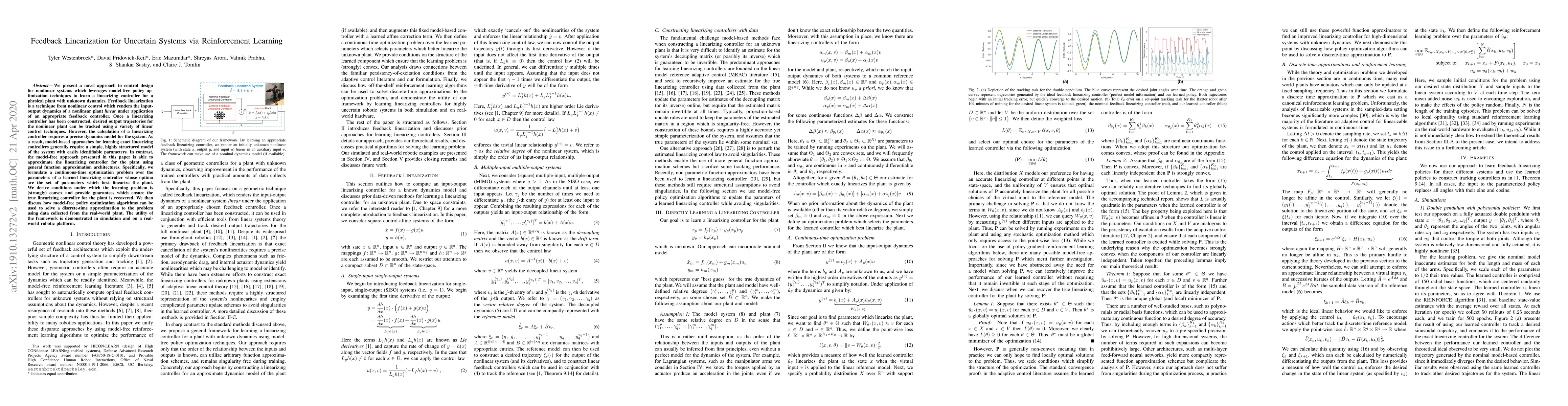 This paper proposes a model-free reinforcement learning approach to design feedback linearizing controllers for nonlinear systems with unknown dynamics. It leverages continuous-time optimization and model-free policy optimization to approximate the linearizing controller, demonstrating its effectiveness through simulations and real-world robotic applications.