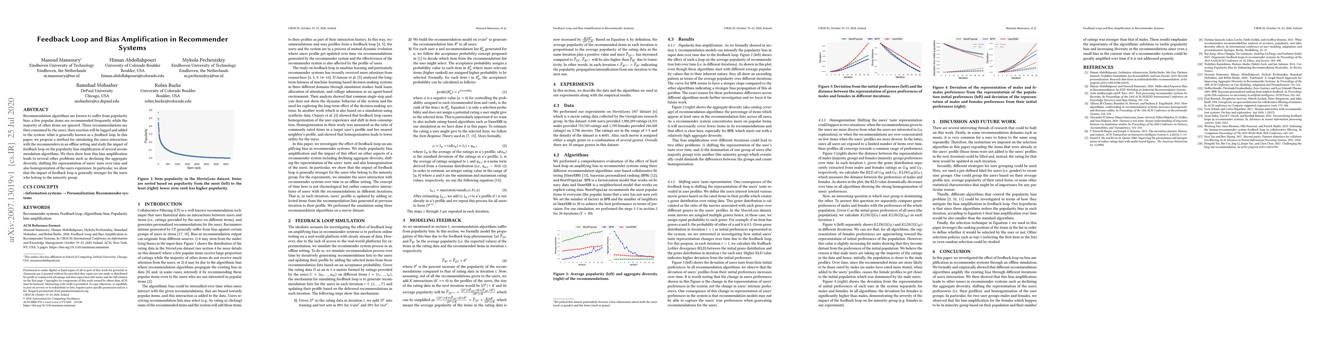 This paper investigates the impact of feedback loops in recommender systems on amplifying popularity bias, leading to declining diversity, shifting user preferences, and homogenization, with stronger effects observed among minority users. The study proposes a simulation method to analyze the interaction between users and recommenders offline.