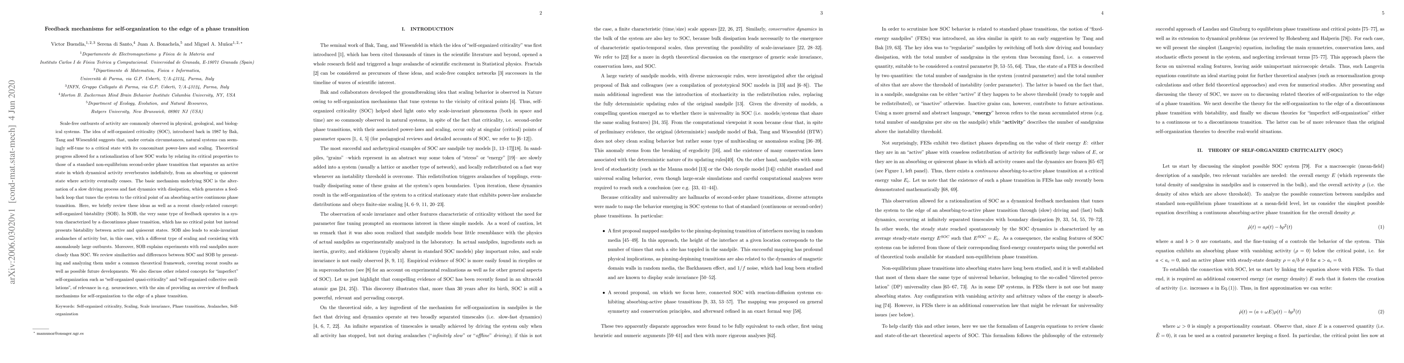 Scale-free outbursts of activity are commonly observed in physical, geological, and biological systems. The idea of self-organized criticality (SOC), introduced back in 1987 by Bak, Tang and Wiesenfeld suggests that, under certain circumstances, natural systems can seemingly self-tune to a critical state with its concomitant power-laws and scaling. Theoretical progress allowed for a rationalization of how SOC works by relating its critical properties to those of a standard non-equilibrium second-order phase transition that separates an active state in which dynamical activity reverberates indefinitely, from an absorbing or quiescent state where activity eventually ceases. Here, we briefly review these ideas as well as a recent closely-related concept: self-organized bistability (SOB). In SOB, the very same type of feedback operates in a system characterized by a discontinuos phase transition, which has no critical point but instead presents bistability between active and quiescent states. SOB also leads to scale-invariant avalanches of activity but, in this case, with a different type of scaling and coexisting with anomalously large outbursts. Moreover, SOB explains experiments with real sandpiles more closely than SOC. We review similarities and differences between SOC and SOB by presenting and analyzing them under a common theoretical framework, covering recent results as well as possible future developments. We also discuss other related concepts for "imperfect" self-organization such as "self-organized quasi-criticality" and "self-organized collective oscillations", of relevance in e.g. neuroscience, with the aim of providing an overview of feedback mechanisms for self-organization to the edge of a phase transition.
