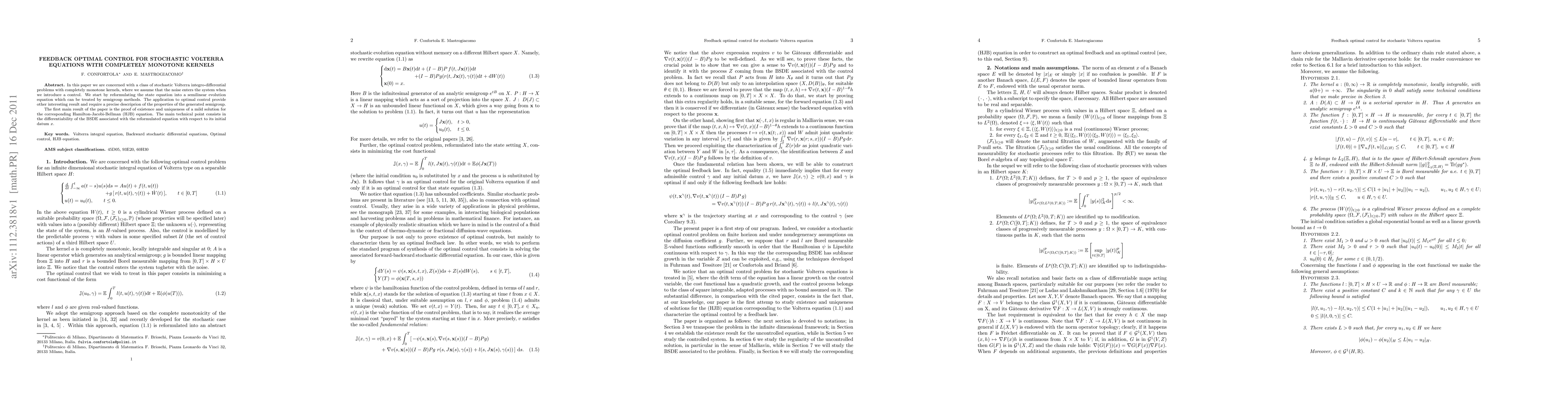 In this paper we are concerned with a class of stochastic Volterra integro-differential problems with completely monotone kernels, where we assume that the noise enters the system when we introduce a control. We start by reformulating the state equation into a semilinear evolution equation which can be treated by semigroup methods. The application to optimal control provide other interesting result and require a precise descriprion of the properties of the generated semigroup. The first main result of the paper is the proof of existence and uniqueness of a mild solution for the corresponding Hamilton-Jacobi-Bellman (HJB) equation. The main technical point consists in the differentiability of the BSDE associated with the reformulated equation with respect to its initial datum x.