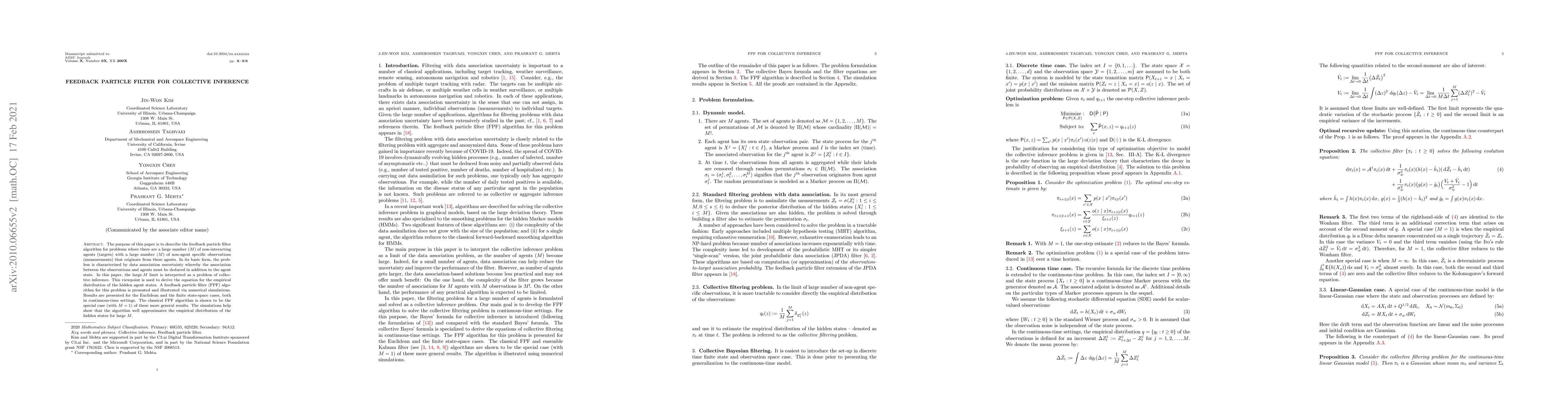 A new algorithm called Feedback Particle Filter is proposed for collective inference problems with many non-interacting agents and measurements, showing improved results for large agent numbers.