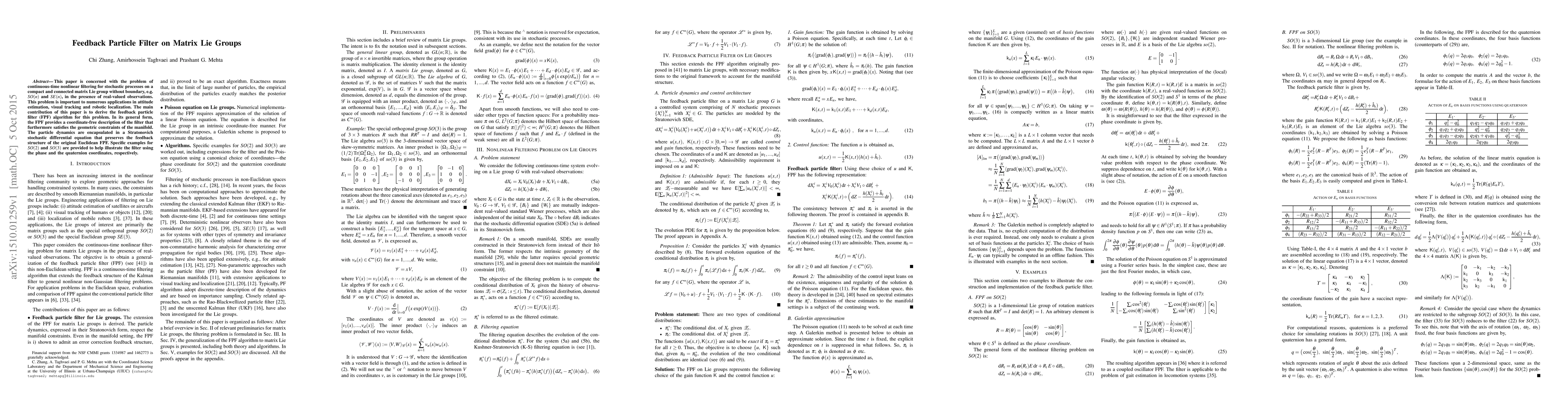 This paper introduces a feedback particle filter algorithm for estimating stochastic processes on compact matrix Lie groups without boundaries, with applications in attitude estimation, tracking, and localization.