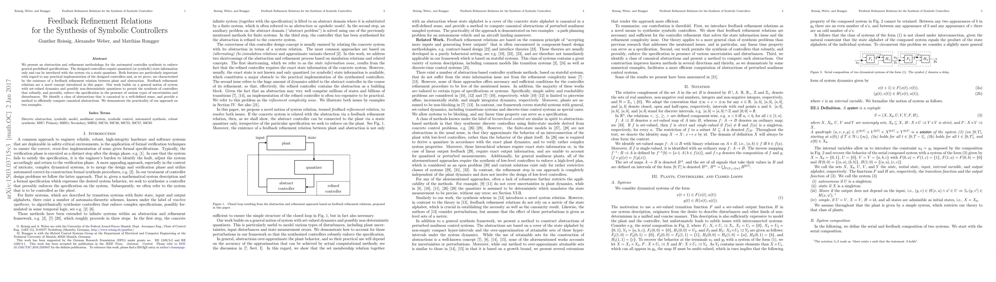 We present an abstraction and refinement methodology for the automated controller synthesis to enforce general predefined specifications. The designed controllers require quantized (or symbolic) state information only and can be interfaced with the system via a static quantizer. Both features are particularly important with regard to any practical implementation of the designed controllers and, as we prove, are characterized by the existence of a feedback refinement relation between plant and abstraction. Feedback refinement relations are a novel concept introduced in this paper. Our work builds on a general notion of system with set-valued dynamics and possibly non-deterministic quantizers to permit the synthesis of controllers that robustly, and provably, enforce the specification in the presence of various types of uncertainties and disturbances. We identify a class of abstractions that is canonical in a well-defined sense, and provide a method to efficiently compute canonical abstractions. We demonstrate the practicality of our approach on two examples.