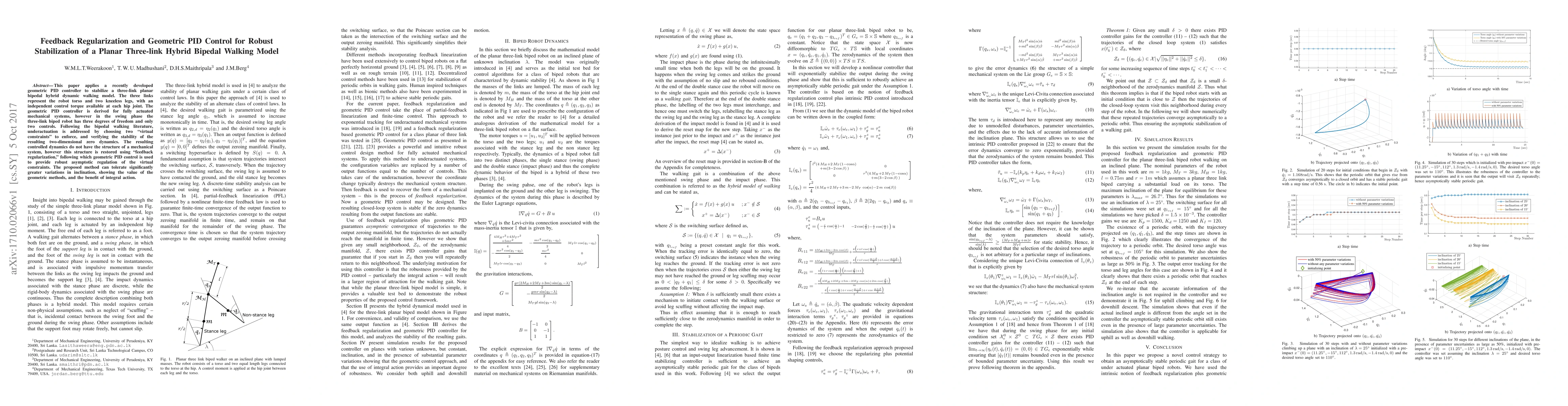 This paper develops a geometric PID controller for stabilizing a three-link planar bipedal hybrid walking model, addressing underactuation by enforcing virtual constraints and using feedback regularization to achieve robust asymptotic regulation. The method demonstrates improved robustness to inclination variations.