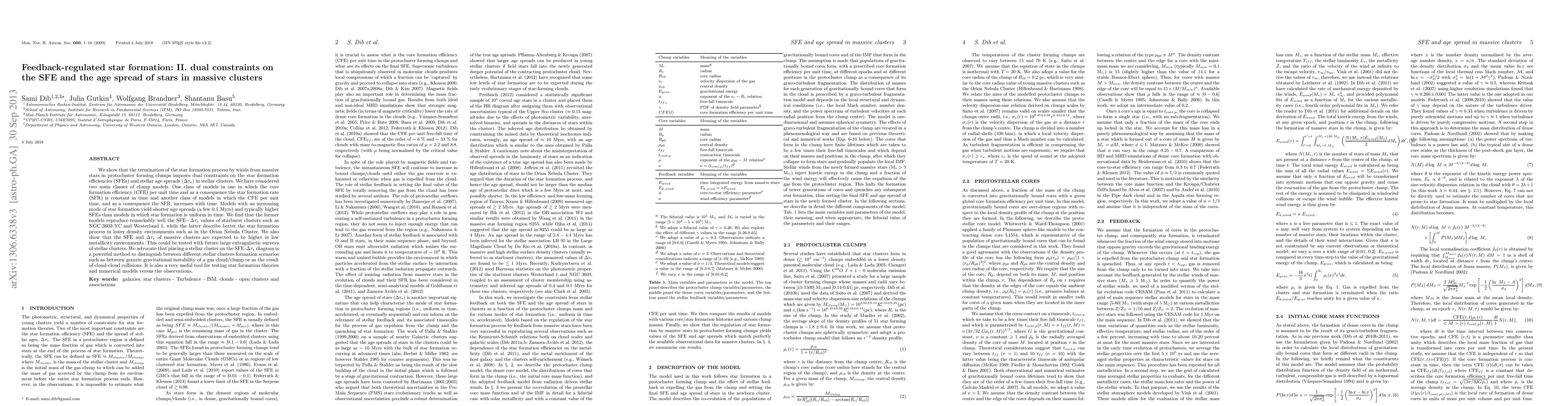 We show that the termination of the star formation process by winds from massive stars in protocluster forming clumps imposes dual constraints on the star formation efficiencies (SFEs) and stellar age spreads ($\Delta \tau_{*}$) in stellar clusters. We have considered two main classes of clump models. One class of models in one in which the core formation efficiency (CFE) per unit time and as a consequence the star formation rate (SFR) is constant in time and another class of models in which the CFE per unit time, and as a consequence the SFR, increases with time. Models with an increasing mode of star formation yield shorter age spreads (a few 0.1 Myrs) and typically higher SFEs than models in which star formation is uniform in time. We find that the former models reproduce remarkably well the SFE$-\Delta \tau_{*}$ values of starburst clusters such as NGC 3603 YC and Westerlund 1, while the latter describe better the star formation process in lower density environments such as in the Orion Nebula Cluster. We also show that the SFE and $\Delta \tau_{*}$ of massive clusters are expected to be higher in low metallicity environments. This could be tested with future large extragalactic surveys of stellar clusters. We advocate that placing a stellar cluster on the SFE-$\Delta \tau_{*}$ diagram is a powerful method to distinguish between different stellar clusters formation scenarios such as between generic gravitational instability of a gas cloud/clump or as the result of cloud-cloud collisions. It is also a very useful tool for testing star formation theories and numerical models versus the observations.