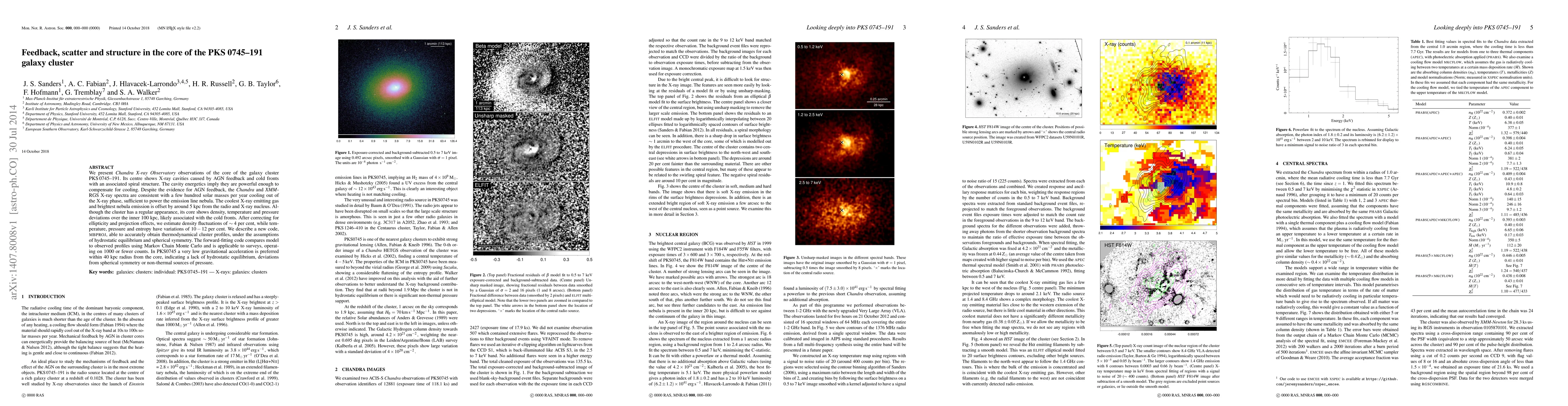 We present Chandra X-ray Observatory observations of the core of the galaxy cluster PKS 0745-191. Its centre shows X-ray cavities caused by AGN feedback and cold fronts with an associated spiral structure. The cavity energetics imply they are powerful enough to compensate for cooling. Despite the evidence for AGN feedback, the Chandra and XMM-RGS X-ray spectra are consistent with a few hundred solar masses per year cooling out of the X-ray phase, sufficient to power the emission line nebula. The coolest X-ray emitting gas and brightest nebula emission is offset by around 5 kpc from the radio and X-ray nucleus. Although the cluster has a regular appearance, its core shows density, temperature and pressure deviations over the inner 100 kpc, likely associated with the cold fronts. After correcting for ellipticity and projection effects, we estimate density fluctuations of ~4 per cent, while temperature, pressure and entropy have variations of 10-12 per cent. We describe a new code, MBPROJ, able to accurately obtain thermodynamical cluster profiles, under the assumptions of hydrostatic equilibrium and spherical symmetry. The forward-fitting code compares model to observed profiles using Markov Chain Monte Carlo and is applicable to surveys, operating on 1000 or fewer counts. In PKS0745 a very low gravitational acceleration is preferred within 40 kpc radius from the core, indicating a lack of hydrostatic equilibrium, deviations from spherical symmetry or non-thermal sources of pressure.