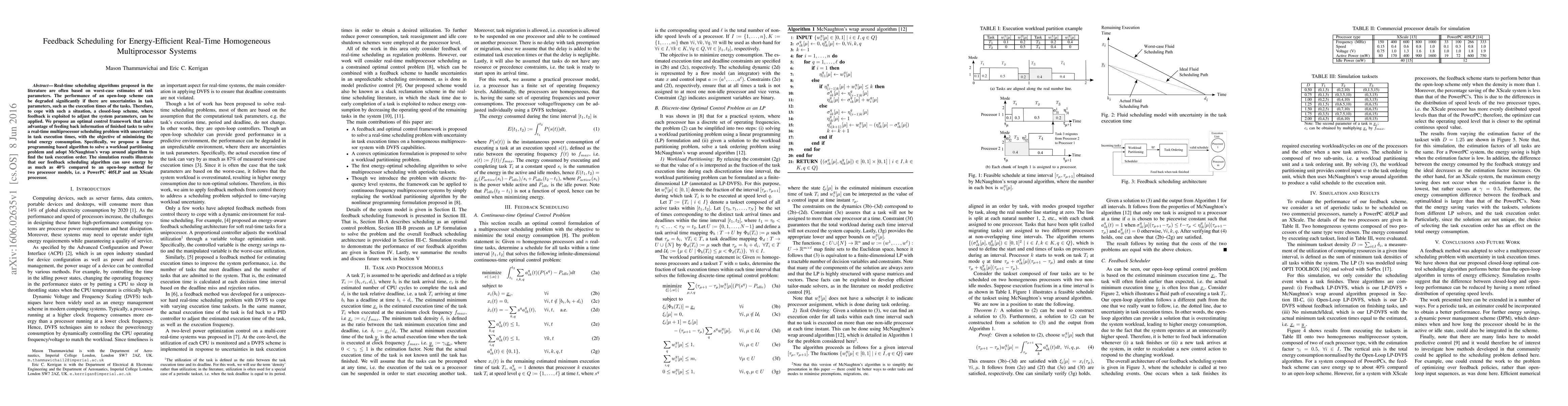This paper proposes a feedback scheduling algorithm for energy-efficient real-time multiprocessor systems, utilizing optimal control to adjust system parameters based on task execution feedback. Simulation results show that the proposed method can reduce energy consumption by up to 40% compared to traditional open-loop methods.