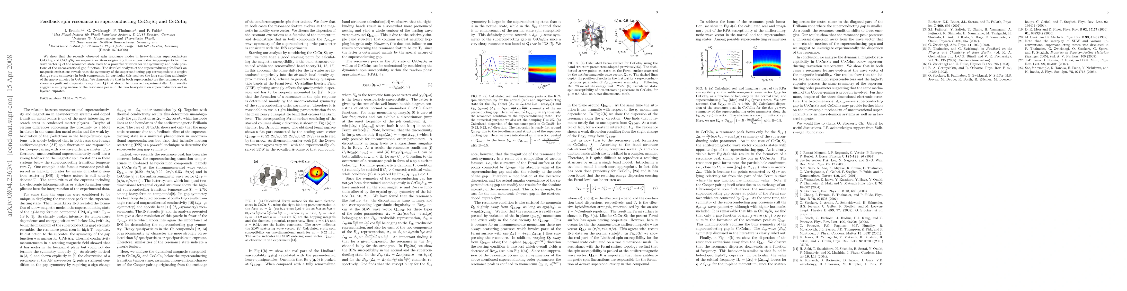 This paper demonstrates that spin resonance in the heavy-fermion superconductors CeCoIn$_5$ and CeCu$_2$Si$_2$ is due to magnetic excitons from superconducting quasiparticles, with the resonance state wave vector ${\bf Q}$ providing insights into the unconventional gap function's symmetry and node positions. The analysis confirms a $d_{x^2-y^2}$ singlet symmetry for both compounds, resolving prior ambiguities, and predicts observable dispersion of the resonance peak away from ${\bf Q}$.