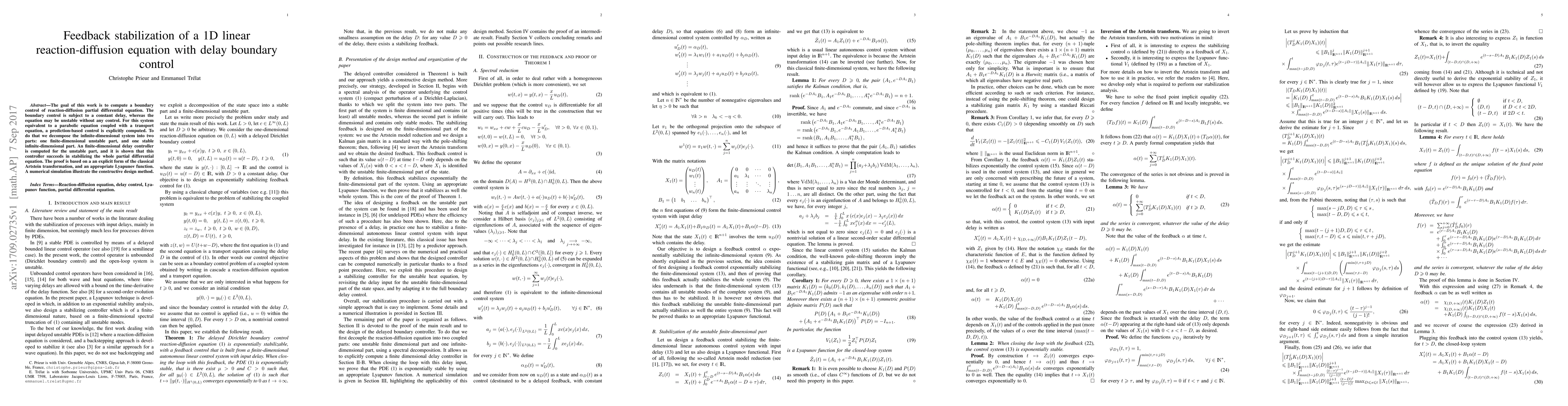This paper develops a feedback stabilization method for a 1D linear reaction-diffusion equation with delay boundary control, decomposing the system into finite and infinite-dimensional parts. A finite-dimensional delay controller is designed for the unstable part, successfully stabilizing the entire system via a prediction-based control method, validated through numerical simulations.