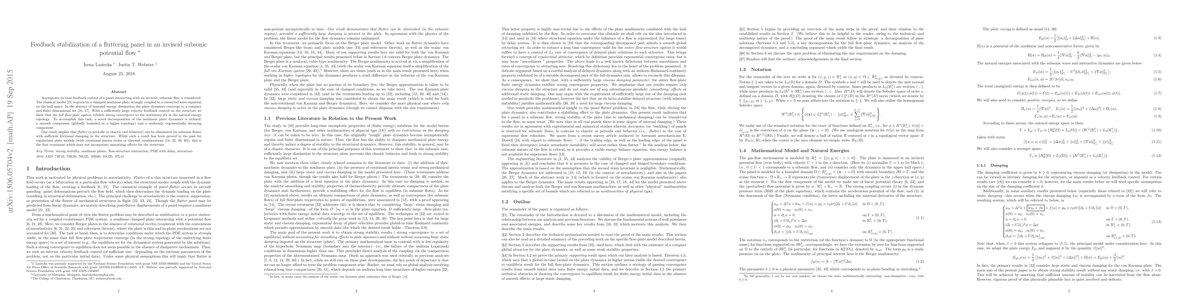 Asymptotic-in-time feedback control of a panel interacting with an inviscid, subsonic flow is considered. The classical model [22] is given by a clamped nonlinear plate strongly coupled to a convected wave equation on the half space. In the absence of imposed energy dissipation the plate dynamics converge to a compact and finite dimensional set [16,17]. With a sufficiently large velocity feedback control on the structure we show that the full flow-plate system exhibits strong convergence to the stationary set in the natural energy topology. In doing so, we demonstrate the existence of an exponential attractor for the plate dynamics. That the exponential attractor exhibits additional smoothness is the technical crux of the main result. This property cannot be taken for granted, as exponential attractors are often compact but not necessarily smooth (in contrast with global maximal attractors). Our result implies that flutter (a periodic or chaotic end behavior) can be eliminated (in subsonic flows) with sufficient frictional damping in the structure. While such a result has been proved in the past for regularized plate models (with rotational inertia terms or thermal considerations [14,33,38,39]), this is the first treatment which does not incorporate smoothing effects for the structure.