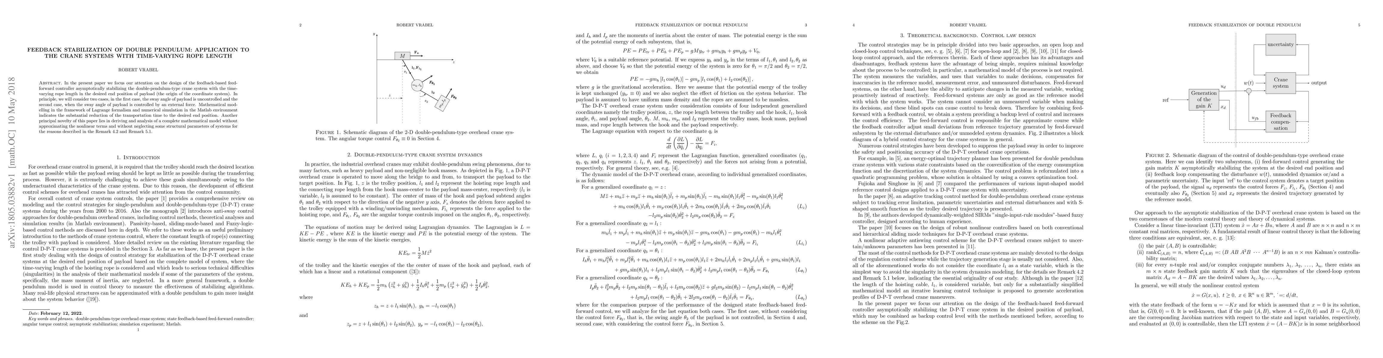 In the present paper we focus our attention on the design of the feedback-based feed-forward controller asymptotically stabilizing the double-pendulum-type crane system with the time-varying rope length in the desired end position of payload (the origin of the coordinate system). In principle, we will consider two cases, in the first case, the sway angle of payload is uncontrolled and the second case, when the sway angle of payload is controlled by an external force. Mathematical modelling in the framework of Lagrange formalism and numerical simulation in the Matlab environment indicate the substantial reduction of the transportation time to the desired end position. Another principal novelty of this paper lies in deriving and analysis of a complete mathematical model without approximating the nonlinear terms and without neglecting some structural parameters of systems for the reasons described in the Remark 4.2 and Remark 5.1.