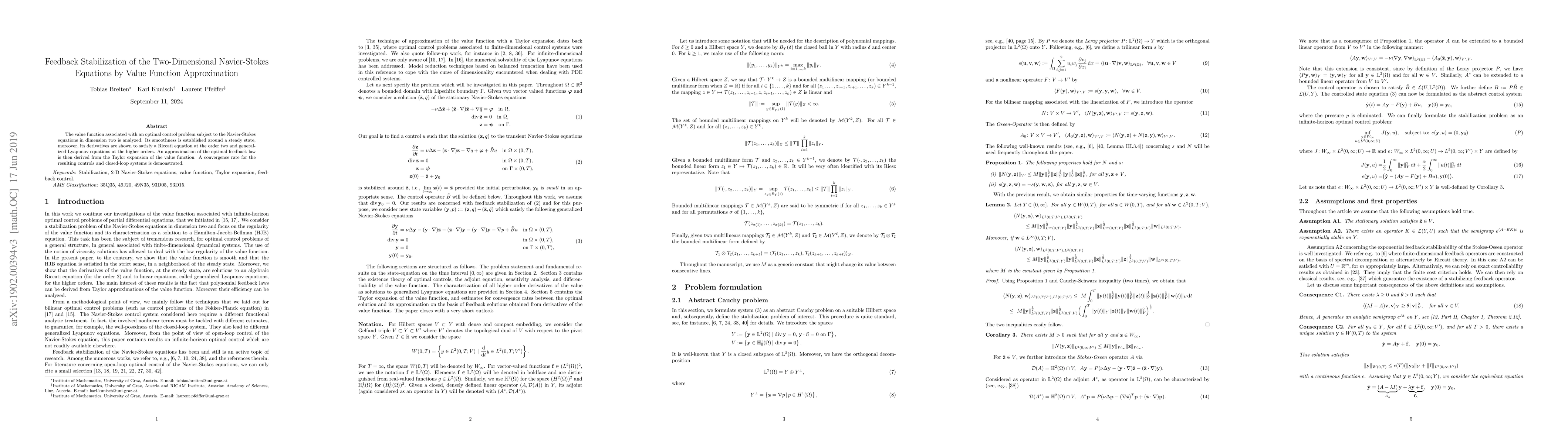 This paper analyzes the value function for an optimal control problem governed by two-dimensional Navier-Stokes equations, establishing its smoothness and derivative properties. An optimal feedback law is approximated via the value function's Taylor expansion, with demonstrated convergence rates for the resulting controls and closed-loop systems.