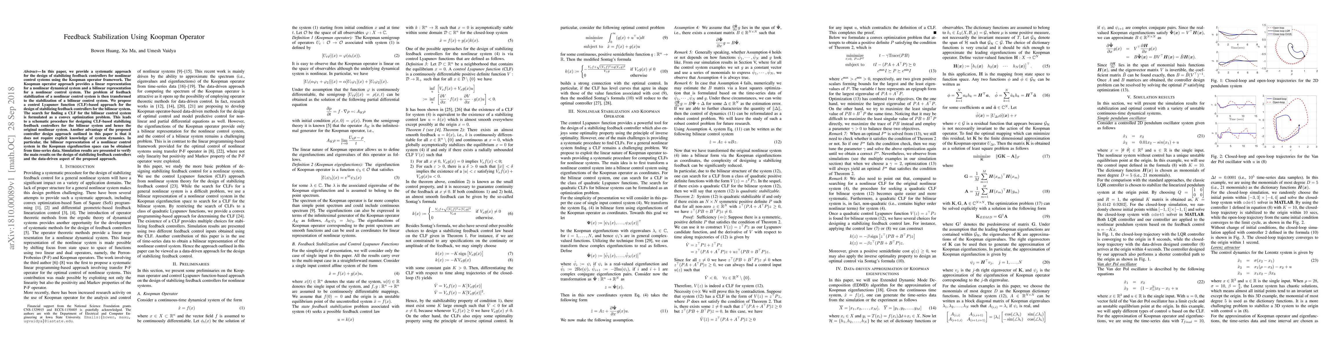 This paper presents a method for designing stabilizing feedback controllers for nonlinear systems using the Koopman operator framework, transforming the problem into a bilinear control system. A control Lyapunov function-based approach is proposed, formulated as a convex optimization problem, enabling the design of controllers without explicit system dynamics knowledge, and validated through simulation.