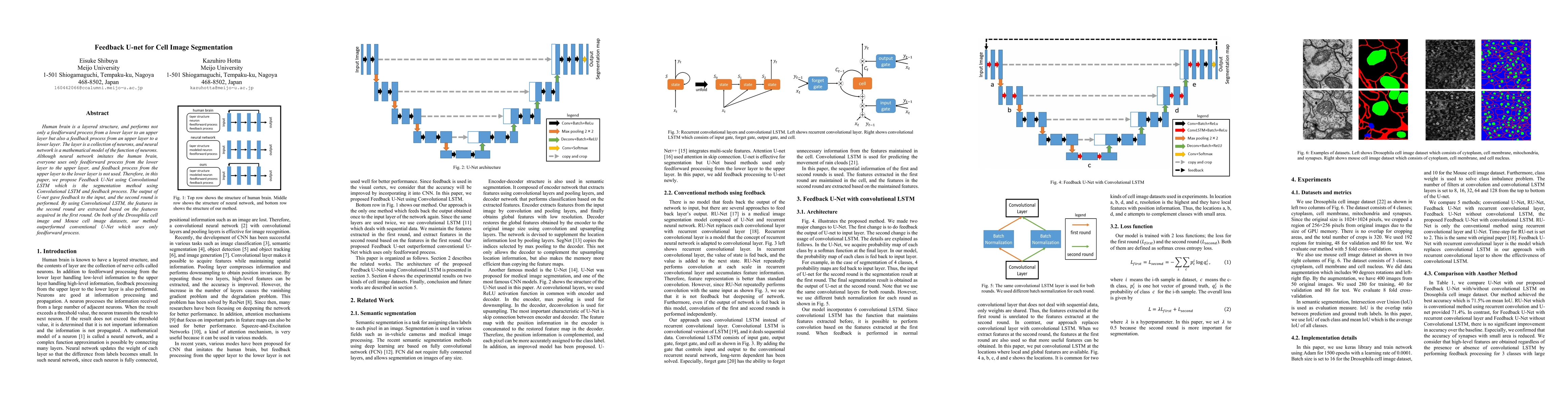 This paper proposes a Feedback U-Net using Convolutional LSTM for cell image segmentation, incorporating a feedback loop to enhance feature extraction. The method outperformed conventional U-Net on Drosophila and Mouse cell image datasets.