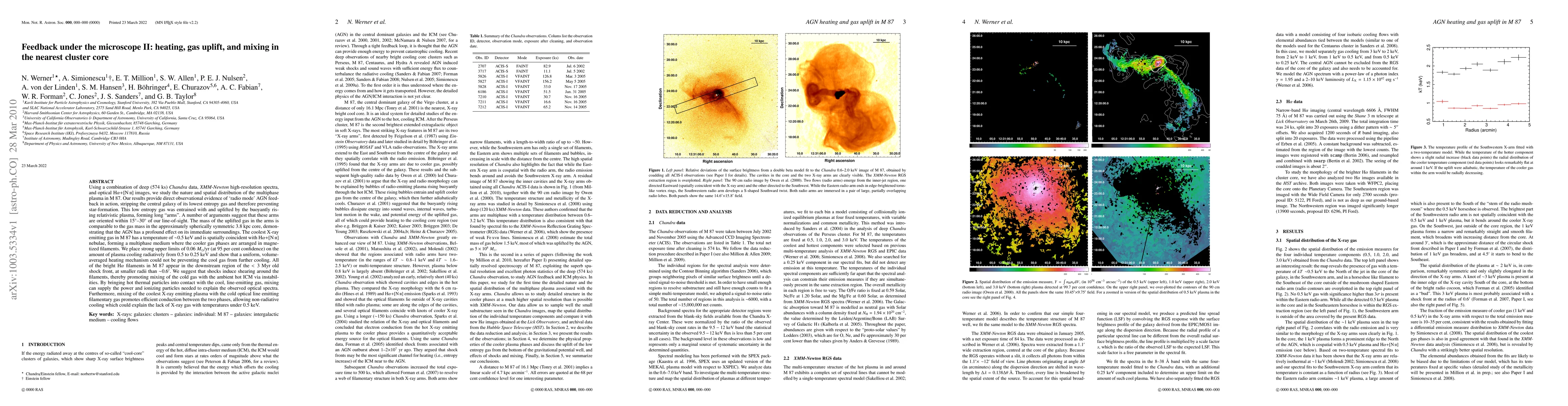 Using a combination of deep 574ks Chandra data, XMM-Newton high-resolution spectra, and optical Halpha+NII images, we study the nature and spatial distribution of the multiphase plasma in M87. Our results provide direct observational evidence of `radio mode' AGN feedback in action, stripping the central galaxy of its lowest entropy gas and preventing star-formation. This low entropy gas was entrained with and uplifted by the buoyantly rising relativistic plasma, forming long "arms". These arms are likely oriented within 15-30 degrees of our line-of-sight. The mass of the uplifted gas in the arms is comparable to the gas mass in the approximately spherically symmetric 3.8 kpc core, demonstrating that the AGN has a profound effect on its immediate surroundings. The coolest X-ray emitting gas in M87 has a temperature of ~0.5 keV and is spatially coincident with Halpha+NII nebulae, forming a multiphase medium where the cooler gas phases are arranged in magnetized filaments. We place strong upper limits of 0.06 Msun/yr on the amount of plasma cooling radiatively from 0.5 keV and show that a uniform, volume-averaged heating mechanism could not be preventing the cool gas from further cooling. All of the bright Halpha filaments appear in the downstream region of the <3 Myr old shock front, at smaller radii than ~0.6'. We suggest that shocks induce shearing around the filaments, thereby promoting mixing of the cold gas with the ambient hot ICM via instabilities. By bringing hot thermal particles into contact with the cool, line-emitting gas, mixing can supply the power and ionizing particles needed to explain the observed optical spectra. Mixing of the coolest X-ray emitting plasma with the cold optical line emitting filamentary gas promotes efficient conduction between the two phases, allowing non-radiative cooling which could explain the lack of X-ray gas with temperatures under 0.5 keV.