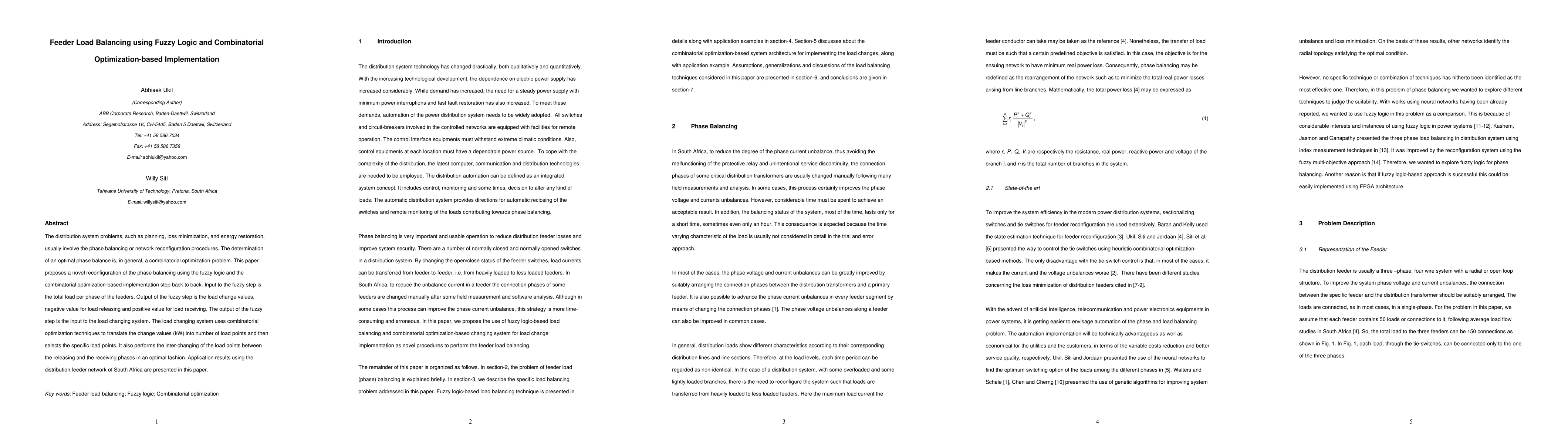 This paper proposes a novel method for feeder load balancing using a combination of fuzzy logic and combinatorial optimization. It employs fuzzy logic to determine load change values and combinatorial optimization to select and interchange specific load points for optimal phase balancing.