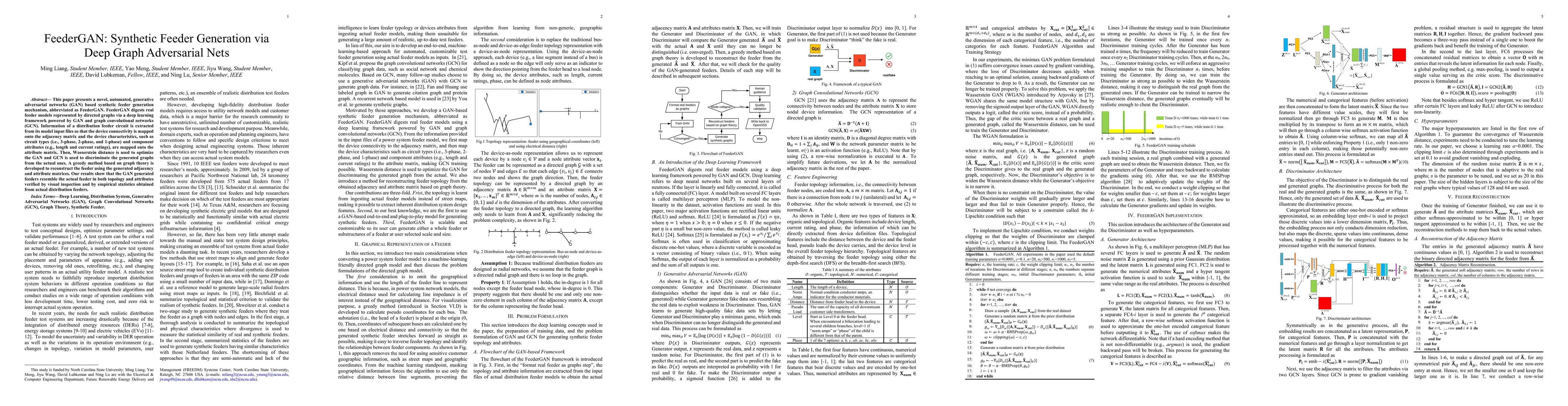 FeederGAN employs GAN and graph convolutional networks to generate synthetic feeder models from real feeder data represented as directed graphs, optimizing the process with Wasserstein distance and reconstructing feeders using graph theory. The generated feeders closely match actual feeder topologies and attributes, validated through visual inspection and statistical analysis.